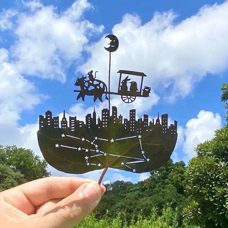 那个时期的叶雕,形式多种多样,除了树叶之外,手艺人还用兽皮、丝绸绢帛等材料,来制作类似叶雕的工艺品。到了现代,艺术家开始在叶雕中,融入现代流行的元素,来自日本的叶雕艺术家利托,就雕刻出了一系列异想天开的作品,他会用树叶的一半雕刻动物人物,另一半作为背景,以树叶的脉络为“地面”,营造出一个故事场景。