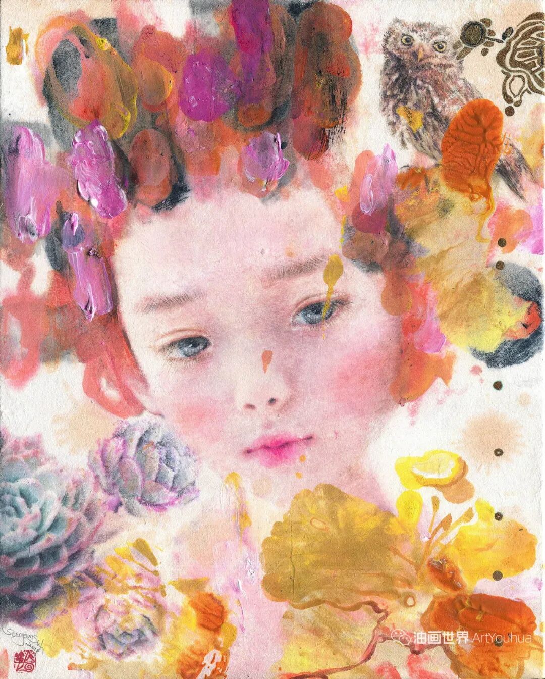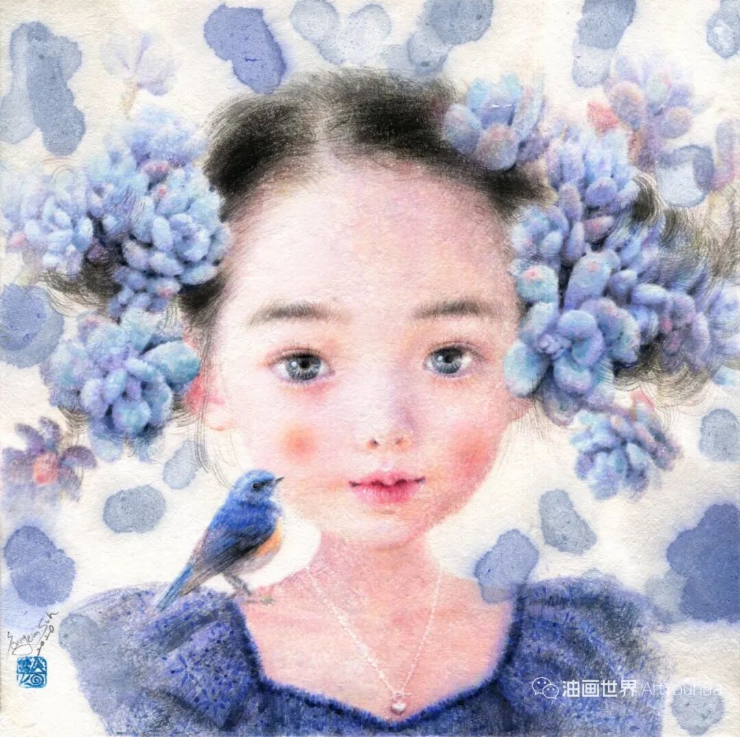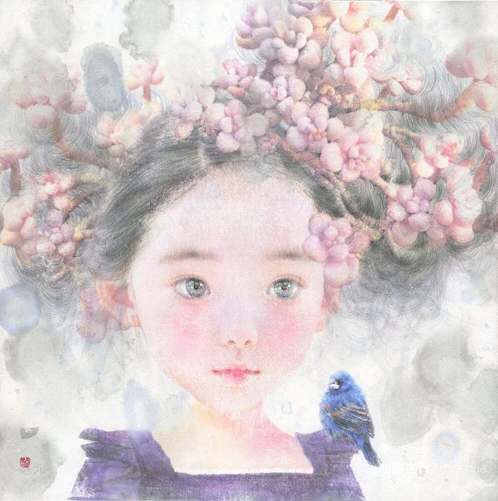 韩国纸和水彩画,墨水,女孩,各种生命形式和工具。所有这些的结合创造了一种梦幻般的气氛,我想撼动和唤醒观众内心深处的纯粹情感。我相信,启蒙和改变可以让世界变得更加纯净和温暖。