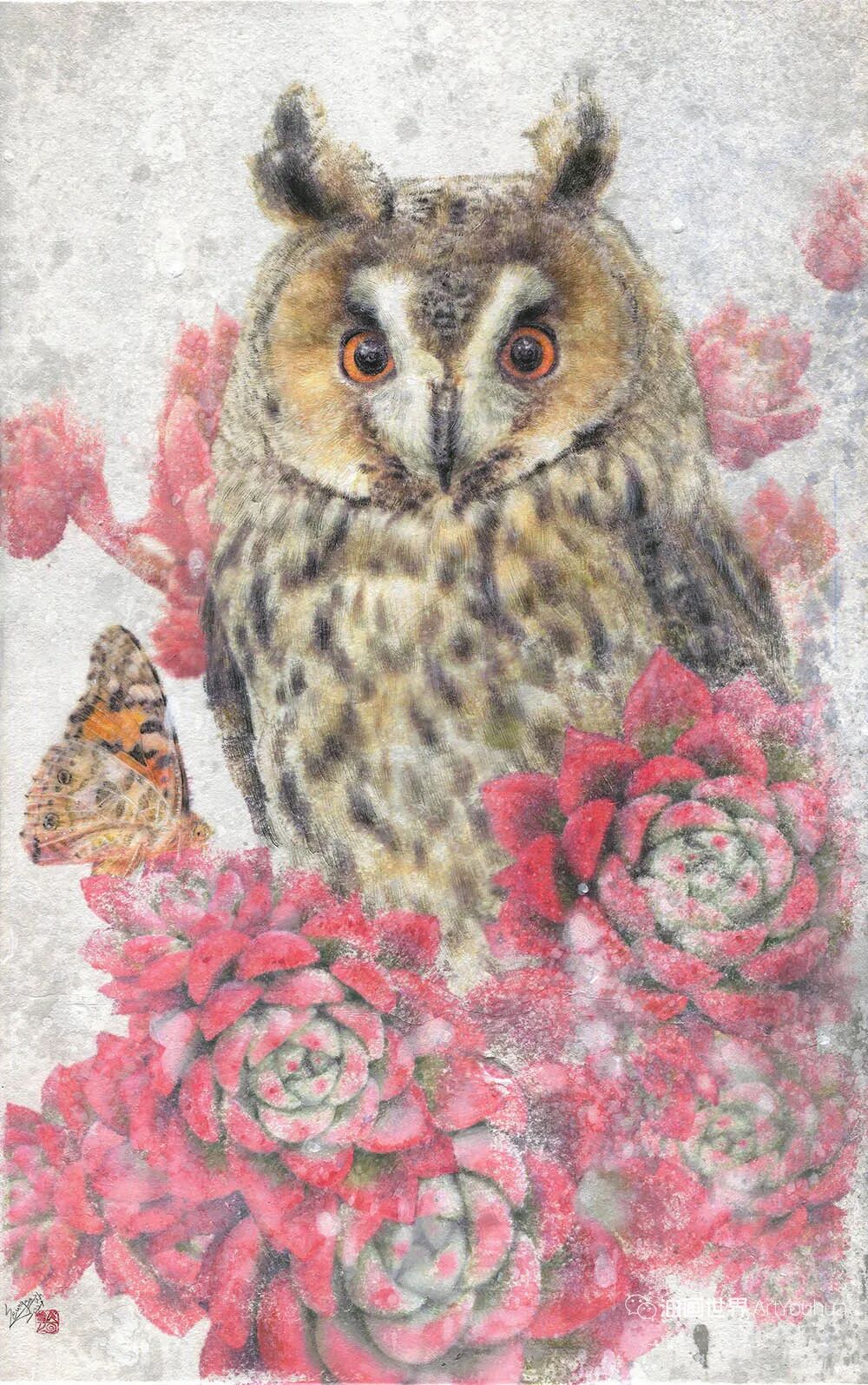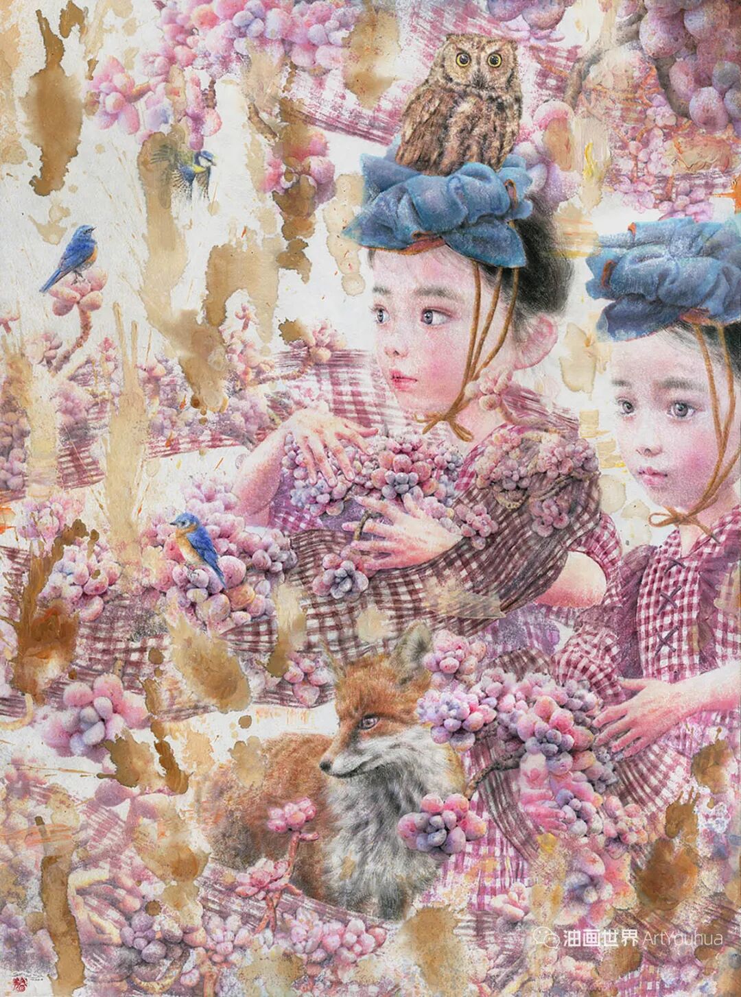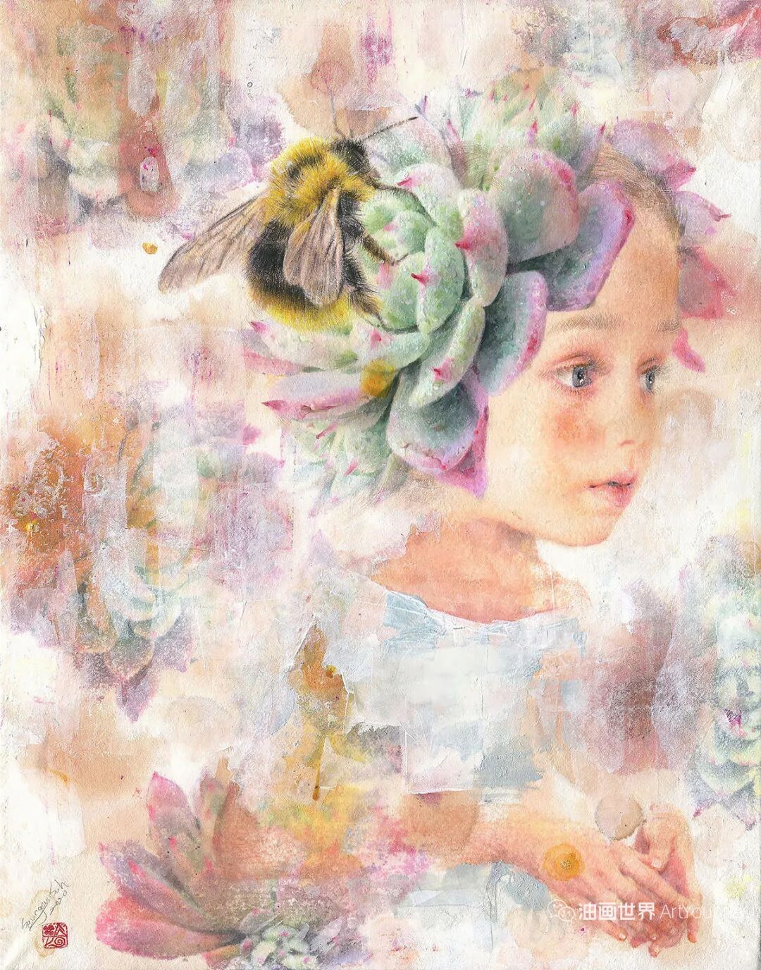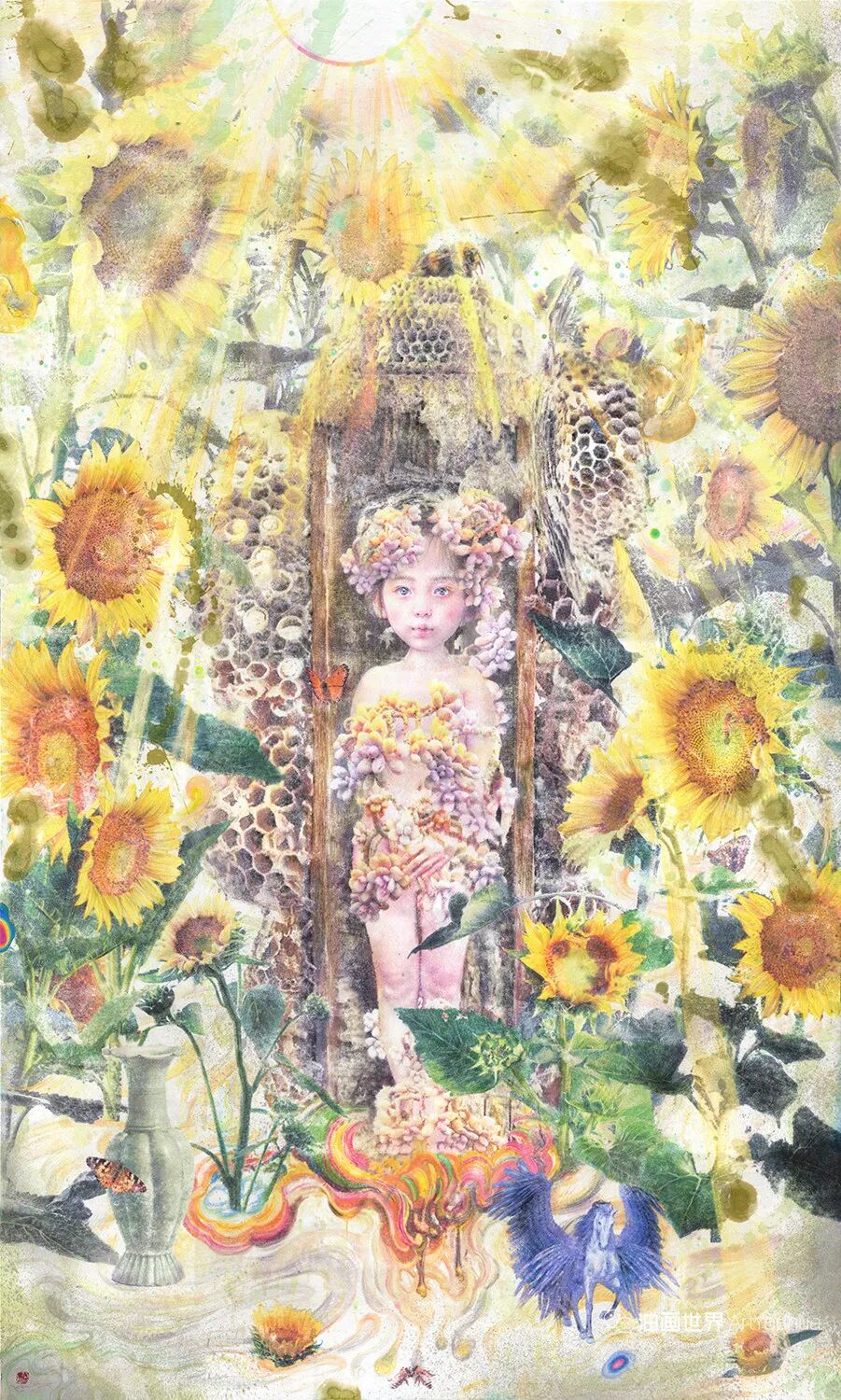 韩国纸和水彩画,墨水,女孩,各种生命形式和工具。所有这些的结合创造了一种梦幻般的气氛,我想撼动和唤醒观众内心深处的纯粹情感。我相信,启蒙和改变可以让世界变得更加纯净和温暖。