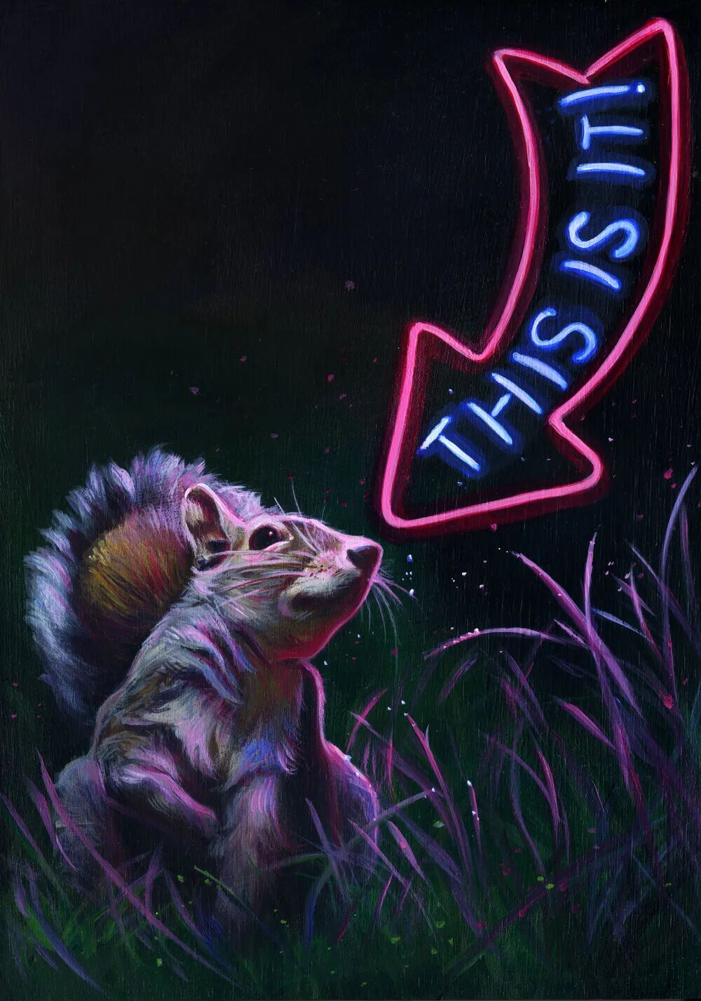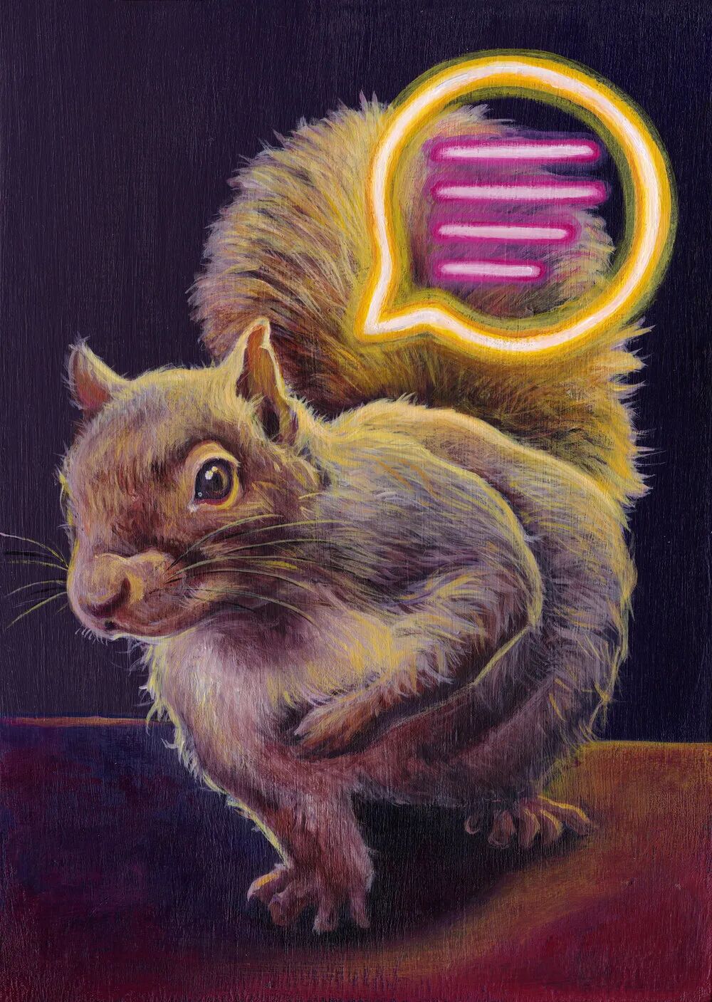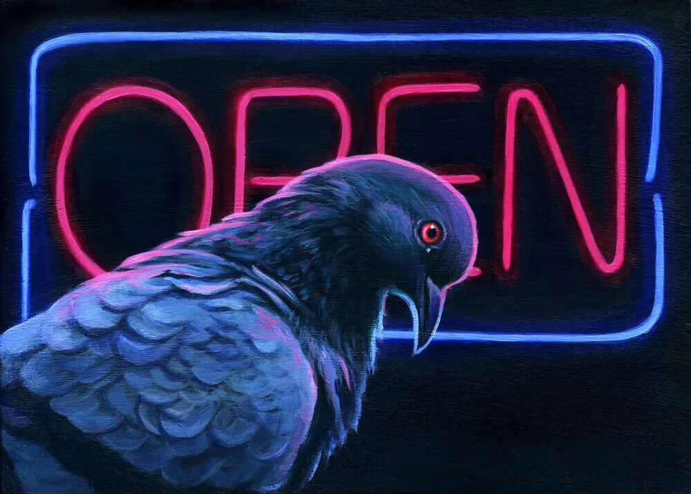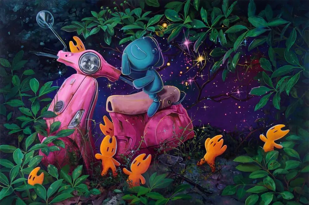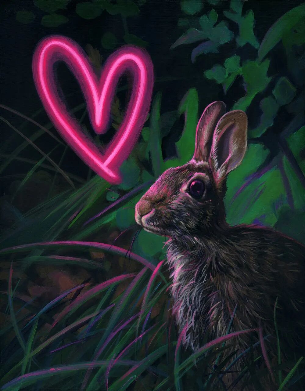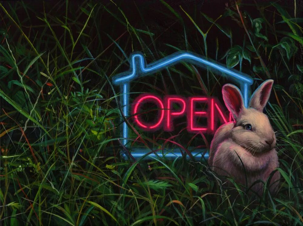 在简单了解完这位艺术家的故事后,我们才能读懂她画作中奇特场景表达的内容,各式各样的动物,似乎寓意着“外乡人”,而绚丽的霓虹灯则象征着大城市给人们带来的诱惑,一幅看似是在描绘动物画作的作品,实际上,在讲述这位画家自己的故事。