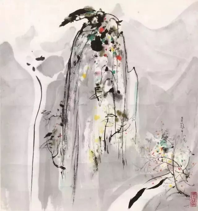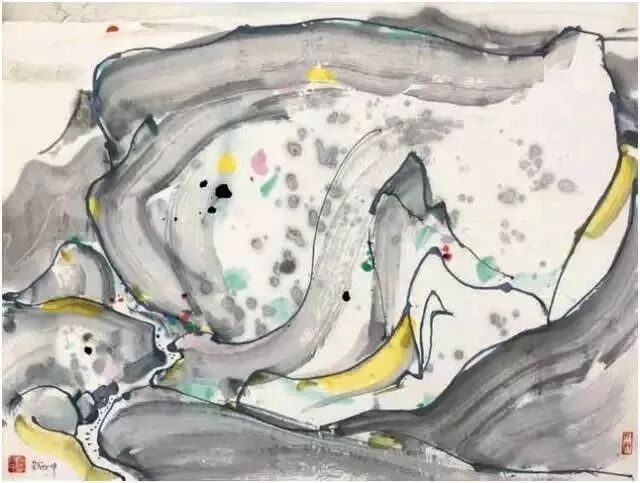 吴冠中用奔腾曲折的细线表现出山石轮廓,灰色排笔板刷随着线条运动,加强了在云影掩映下,山石变幻莫测的动感。