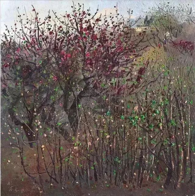 而后几株盛放的梅花树占据了中景,树干粗犷刚健,很有中国写意山水画中的虬枝老干的笔意。梅花用的是西画中的点彩手法,不同角度的梅花用不同色彩区分明暗,层次分明。