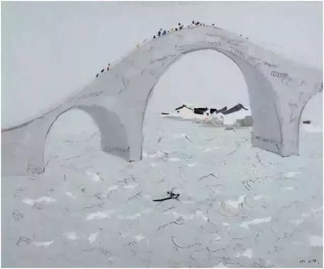就像这幅《忆杭州》,既有油画的笔触和银灰的基调,又有黑瓦白墙小桥流水的东方风韵,水波的节奏感像诗,像散文,像音乐。在他的眼中,不只绘画之间没有界限,整个艺术范畴都是共通的。