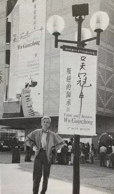 1995年10月,吴冠中于香港艺术馆画展海报前。