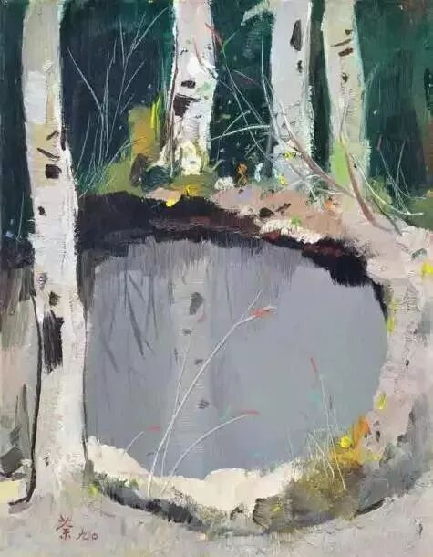 井水宁静无波,形成了光滑平整的镜面,构成了画面最大面积的灰色基调。水面映出井边生长的白桦树和丛生的杂草,或粗或细的线条打破了镜面的单调。