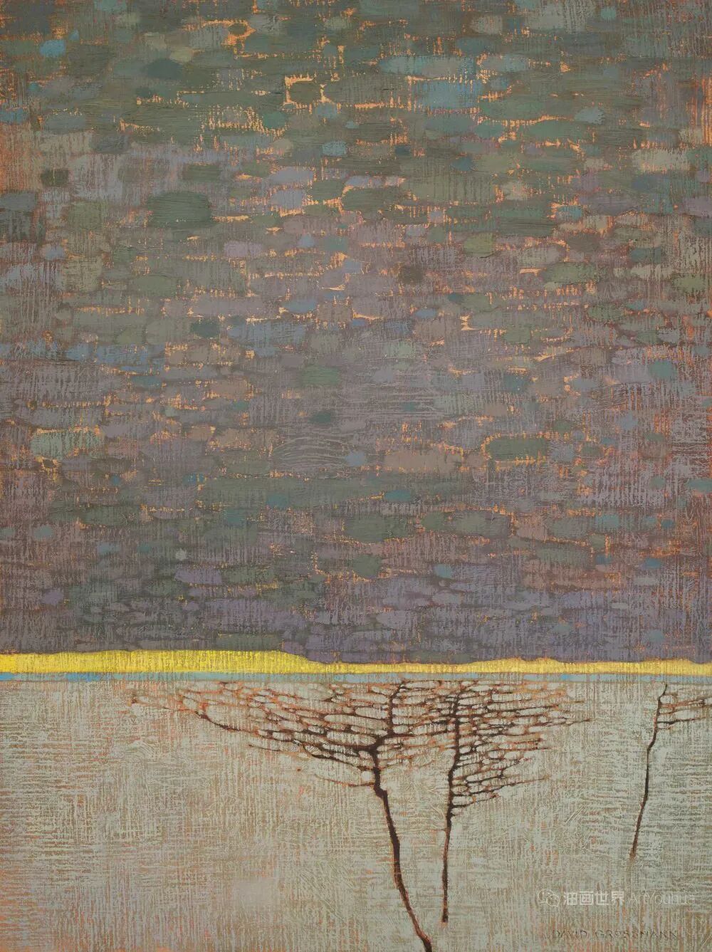 格罗斯曼的作品将几百年前的技术与当代美学融合在一起,弥合了新旧,传统与抽象之间的鸿沟。他在手工制作的面板上工作,这些面板成为他在工作室绘画中精心开发的发光颜料层和复杂的表面纹理的基础。格罗斯曼经常在户外跋涉以直接自然地绘画,这是一个耗时,沉思的过程。
