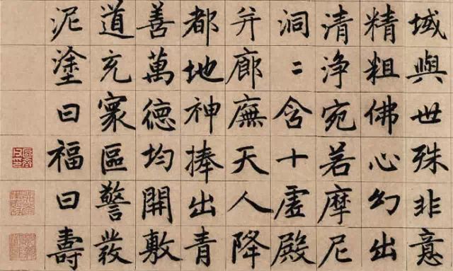 第三,笔圆架方,流动带行。书写赵体时,点画需圆润华滋,但结构布白却要十分注意方正谨严,横直相安、撇捺舒展、重点安稳。只有这样,才能掌握赵体的特点。另外,他书写楷书时略掺用行书的笔法,使字字流美动人,也是赵体的特点之一。