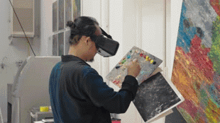 事实上他是戴上了数字眼镜,面对一盘颜料全部成为黑白时随机用彩色绘画,最后绚丽色彩都是随机在自然状态下产生。