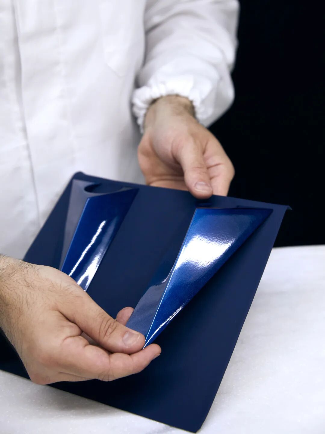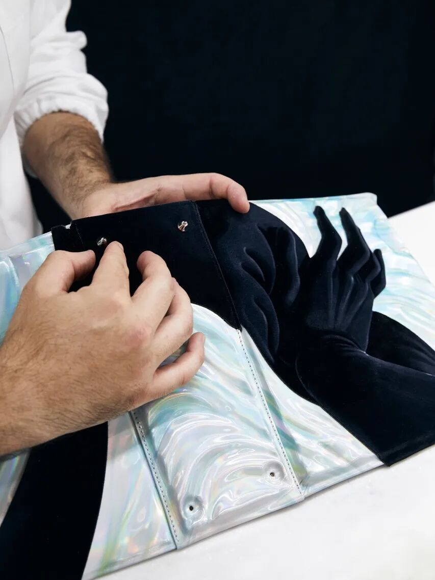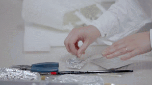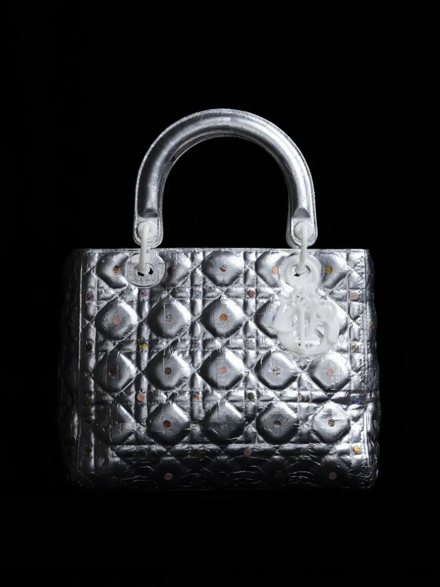 事实上要制作它,首先需要高精度的扫描和3D打印,艺术家再根据Lady Dior藤格纹排列的方式将锡箔纸做成单张10 x 10的尺寸进行折叠;折叠展开后显露隐秘的网格,微妙地呈现出空间的变化。