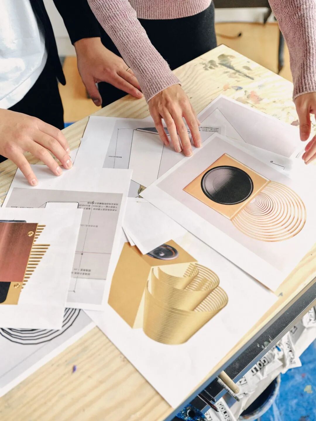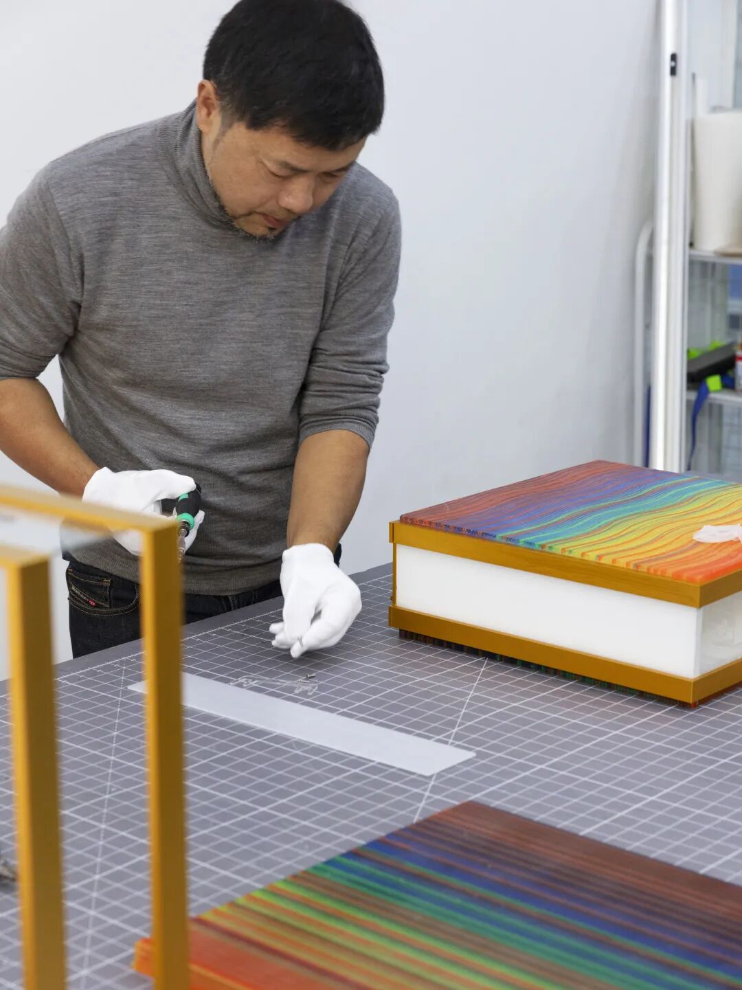 随后,艺术家再用贴锡箔纸的方式细密地将其吸附上去。最后每一个藤格纹中间的小圆点,是她将自己标志性创作元素仙人掌计算纸打成的碎点贴上去。