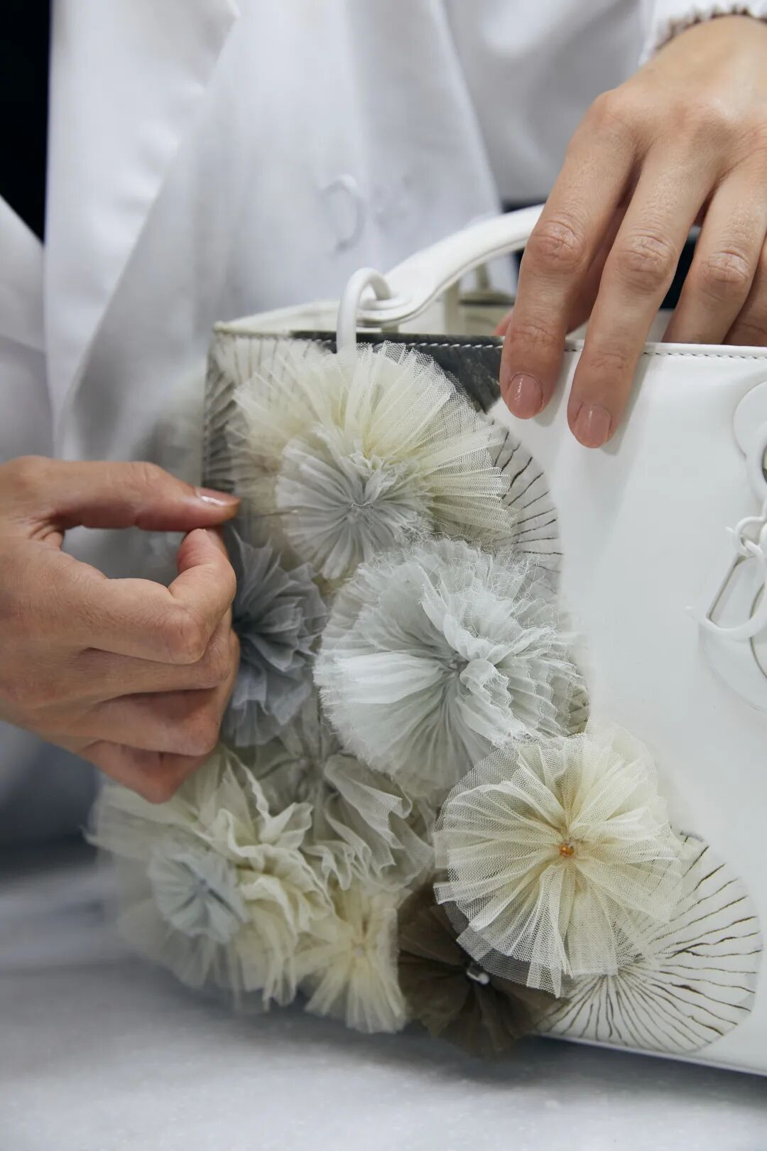 还有呈现四款不同风格的韩国艺术家金珉廷。她痴迷用高丽纸(类似我国水墨画的宣纸)分层创作,这一次分层材质变成了皮草、薄纱和钉珠,最后做出一只只渐变色手袋。