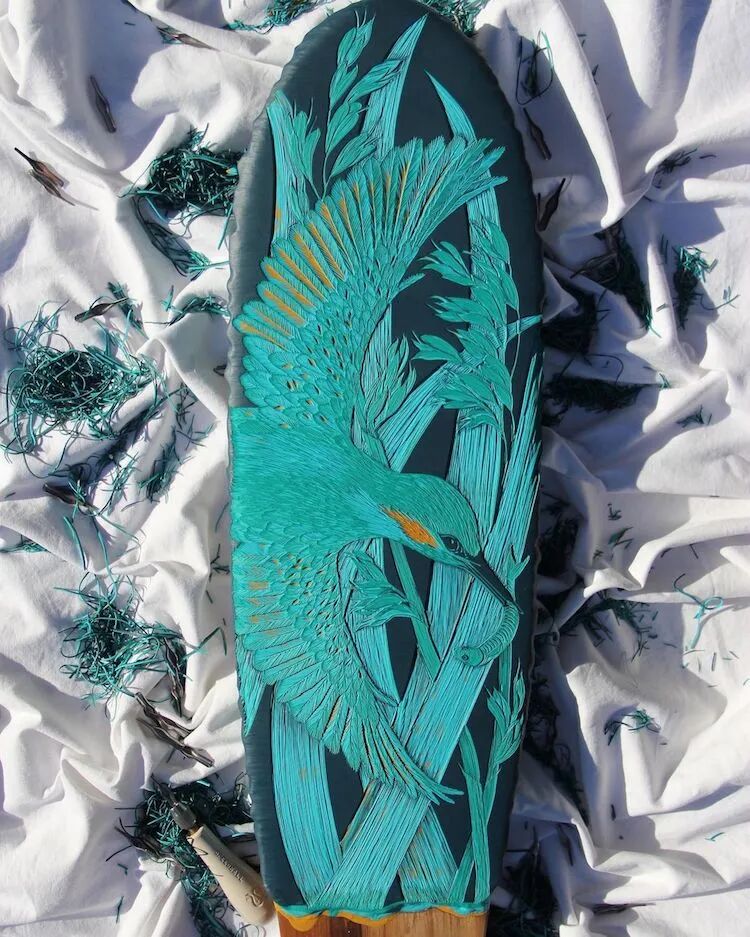 等到丙烯颜料全部干燥后,就可以进行下一步创作了,这一步创作类似版画制作的过程,艺术家会用刻刀将涂抹丙烯颜料的色层按照计划创作的图案进行雕刻,用刻刀雕刻每一层的颜料都在艺术家的计算里,就这样将原本的丙烯色层雕刻下来,一幅充满质感的作品就出现了。
