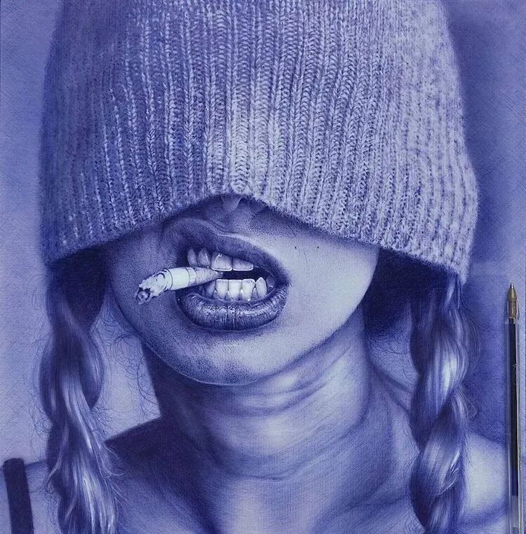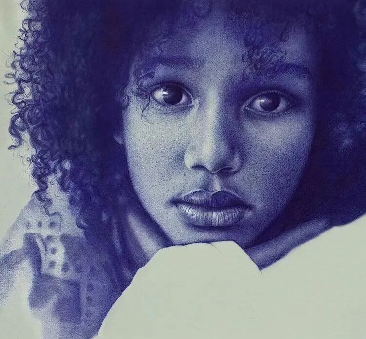 保卢斯的圆珠笔画将人物的每一个细节刻画到了极致,即使主体的脸部被遮挡,细节也令人难以置信。比如皮肤的细腻纹理,以及面部的毛孔和细纹等等,都清晰可见,尤其是人物的眼神,这位艺术家的作品最引人注目的,就是他能够捕捉到眼睛的光亮,不管画中人是在直视前方,还是看向旁边,她们的目光中都包含着与照片甚至现实生活中相同的光彩。