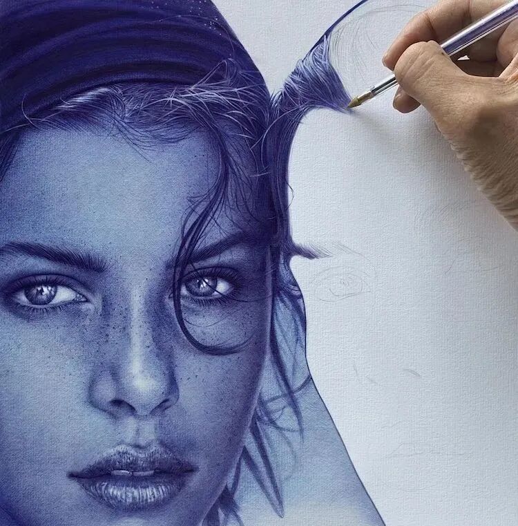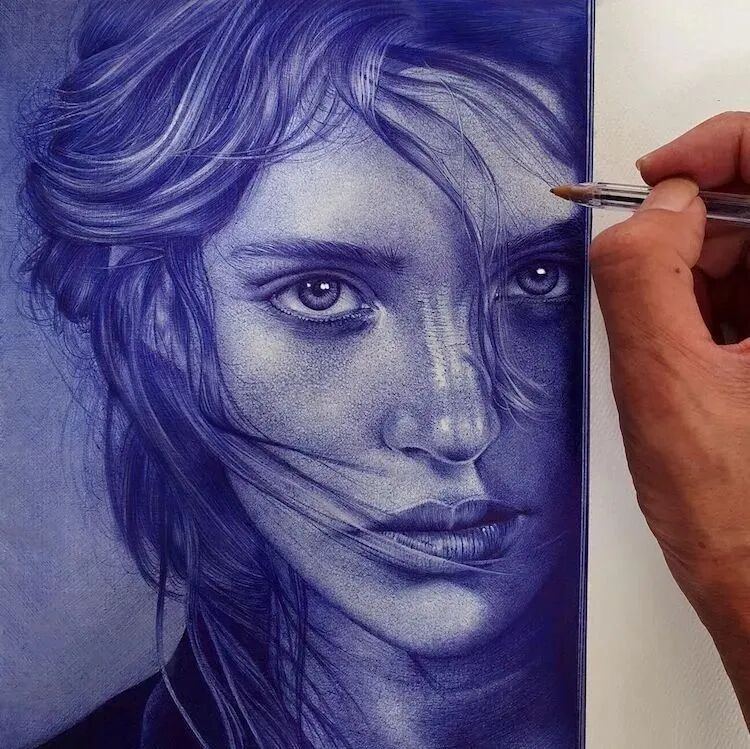 后来,他开始画一些普通人,保卢斯的画作中的主角大部分是女性,并且这位艺术家十分擅长描绘面容姣好的女性,他画出的超写实女孩,能够把人看呆。保卢斯直言,用圆珠笔画画是一个非常享受的过程,从用轻巧的笔触勾画人物的轮廓,到一点点、一层层让整个画面变成蓝色,会让自己充满成就感。