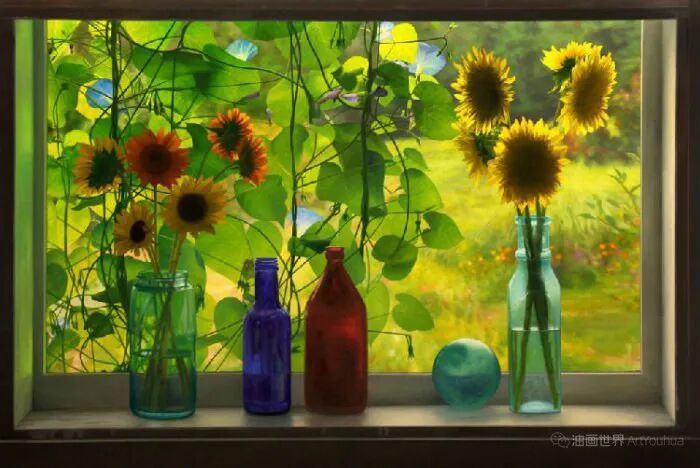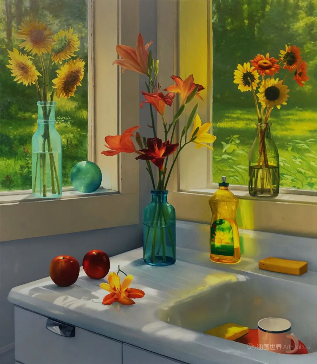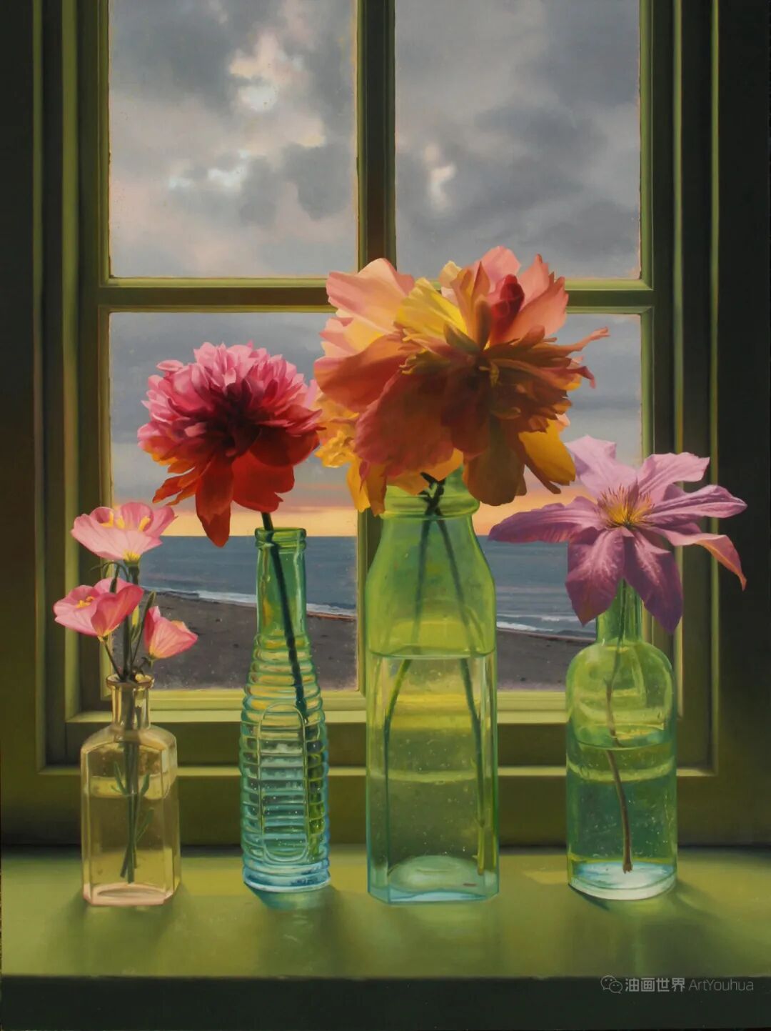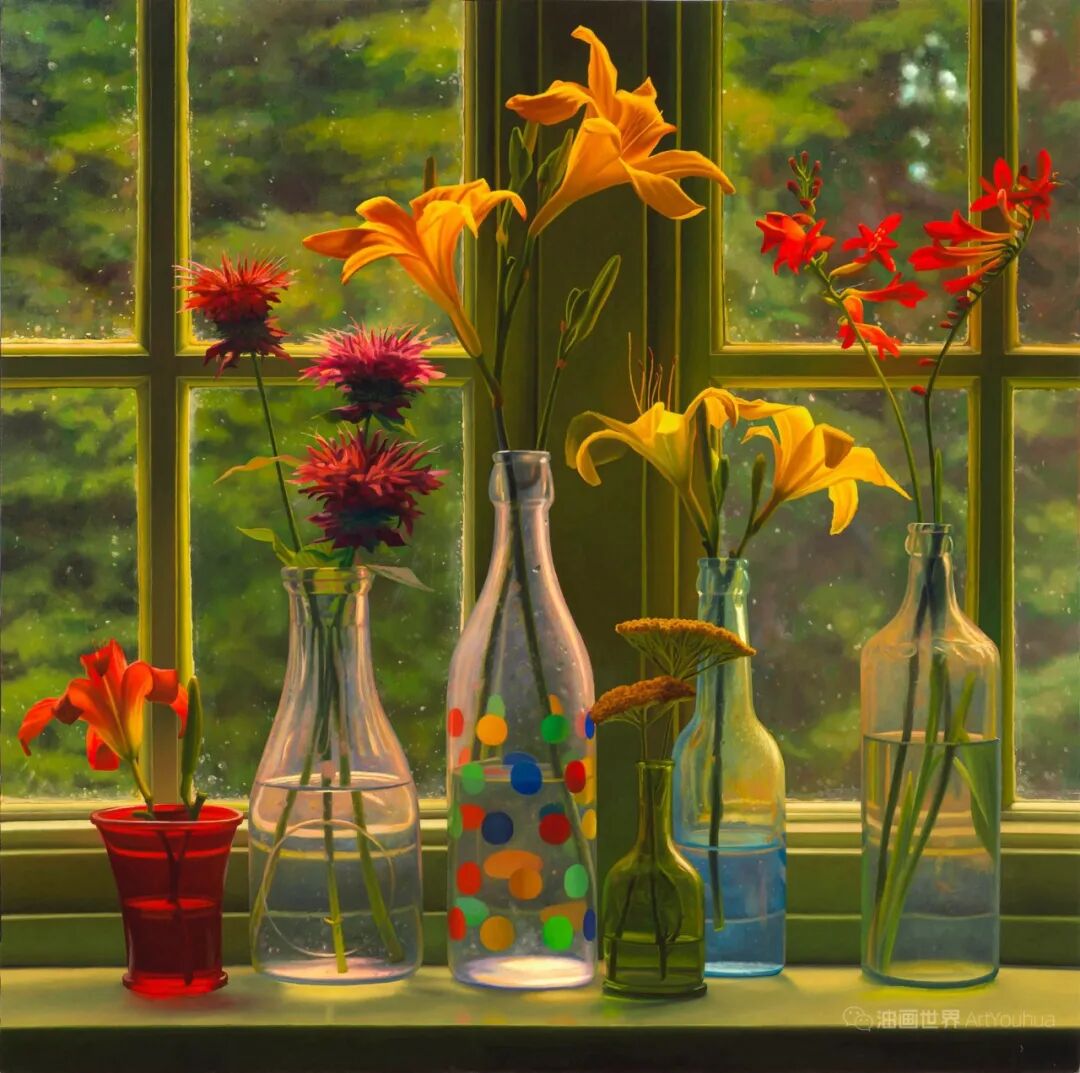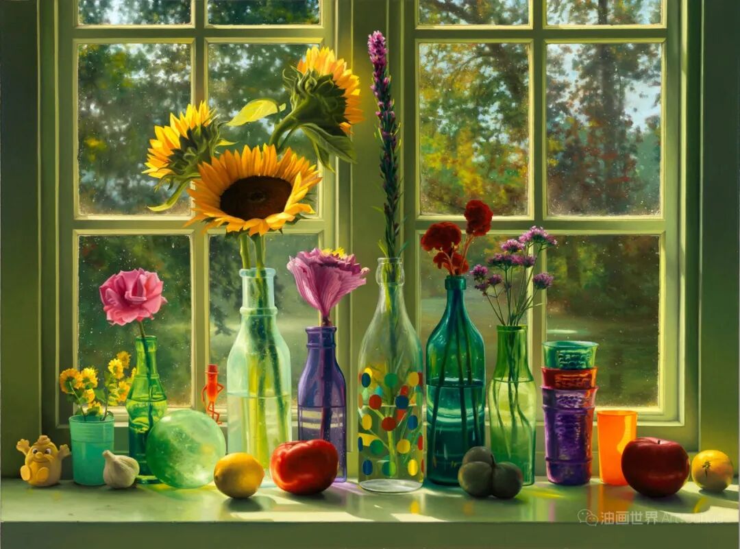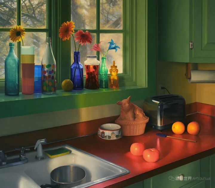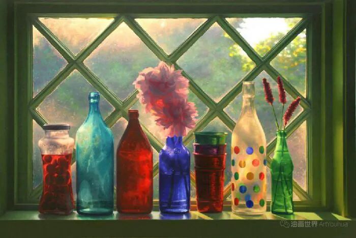 斯科特·普里奥将形状色彩各异的玻璃瓶子排列放在窗前,在光的照射中透出各种微妙的色彩变化,异常美丽。他的画作描绘了一个亲密、简单和个人的世界,物体被光所震撼和变形。绘画作品风格清新,真实感强,给人以强烈的视觉震撼。色彩处理也相当完美,甚至毫无瑕疵。