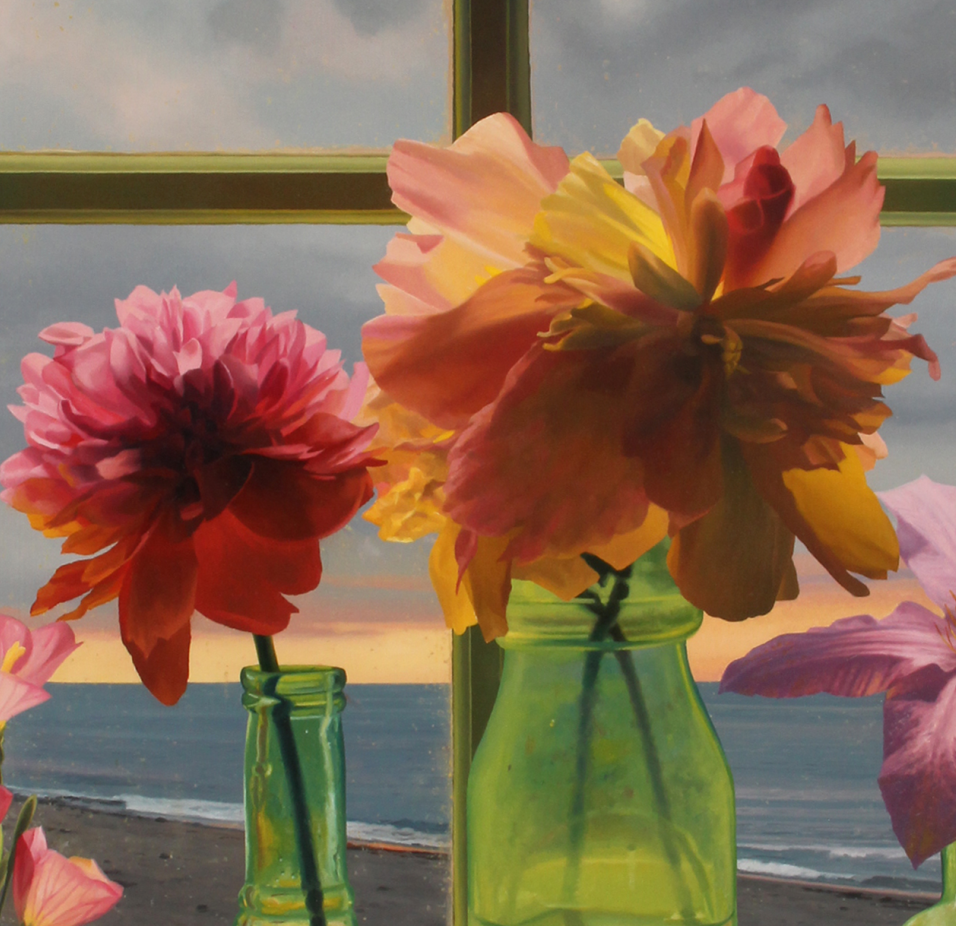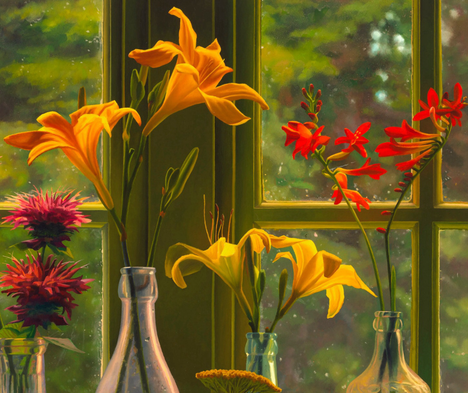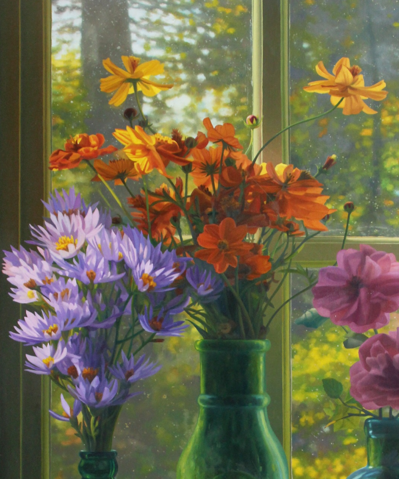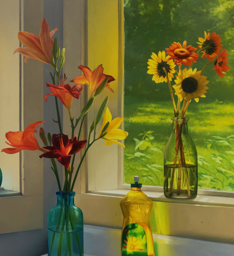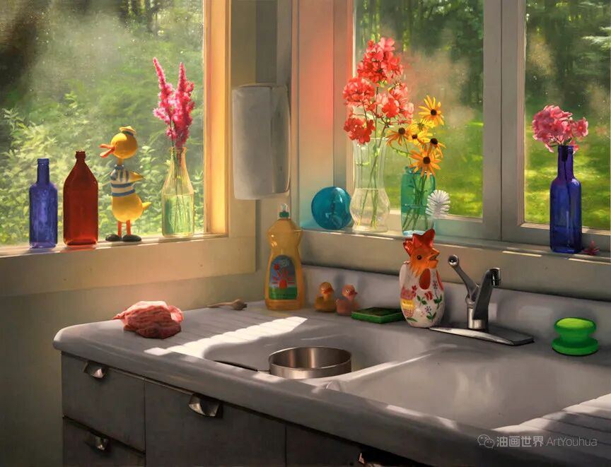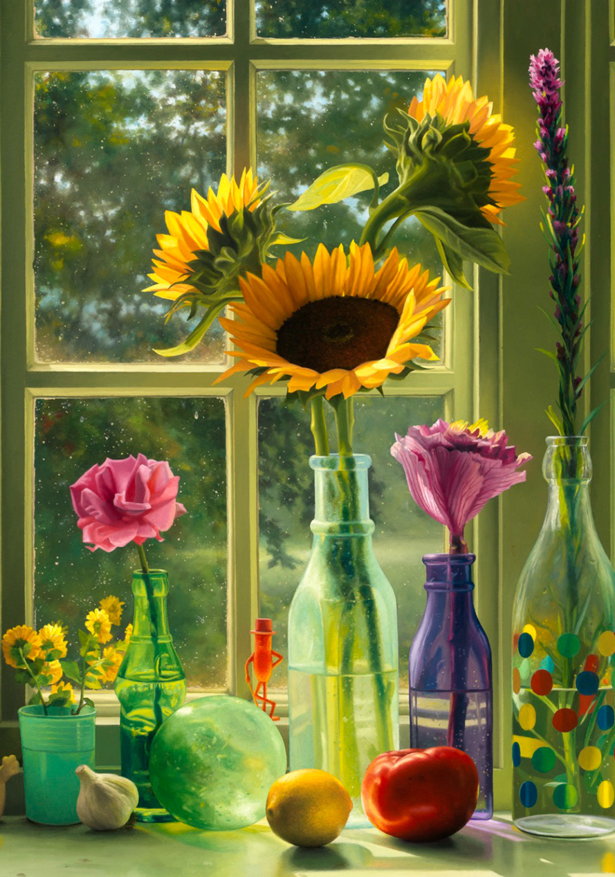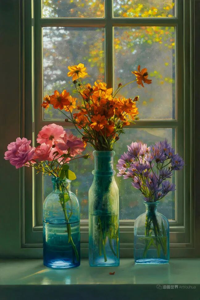 斯科特·普里奥将形状色彩各异的玻璃瓶子排列放在窗前,在光的照射中透出各种微妙的色彩变化,异常美丽。他的画作描绘了一个亲密、简单和个人的世界,物体被光所震撼和变形。绘画作品风格清新,真实感强,给人以强烈的视觉震撼。色彩处理也相当完美,甚至毫无瑕疵。