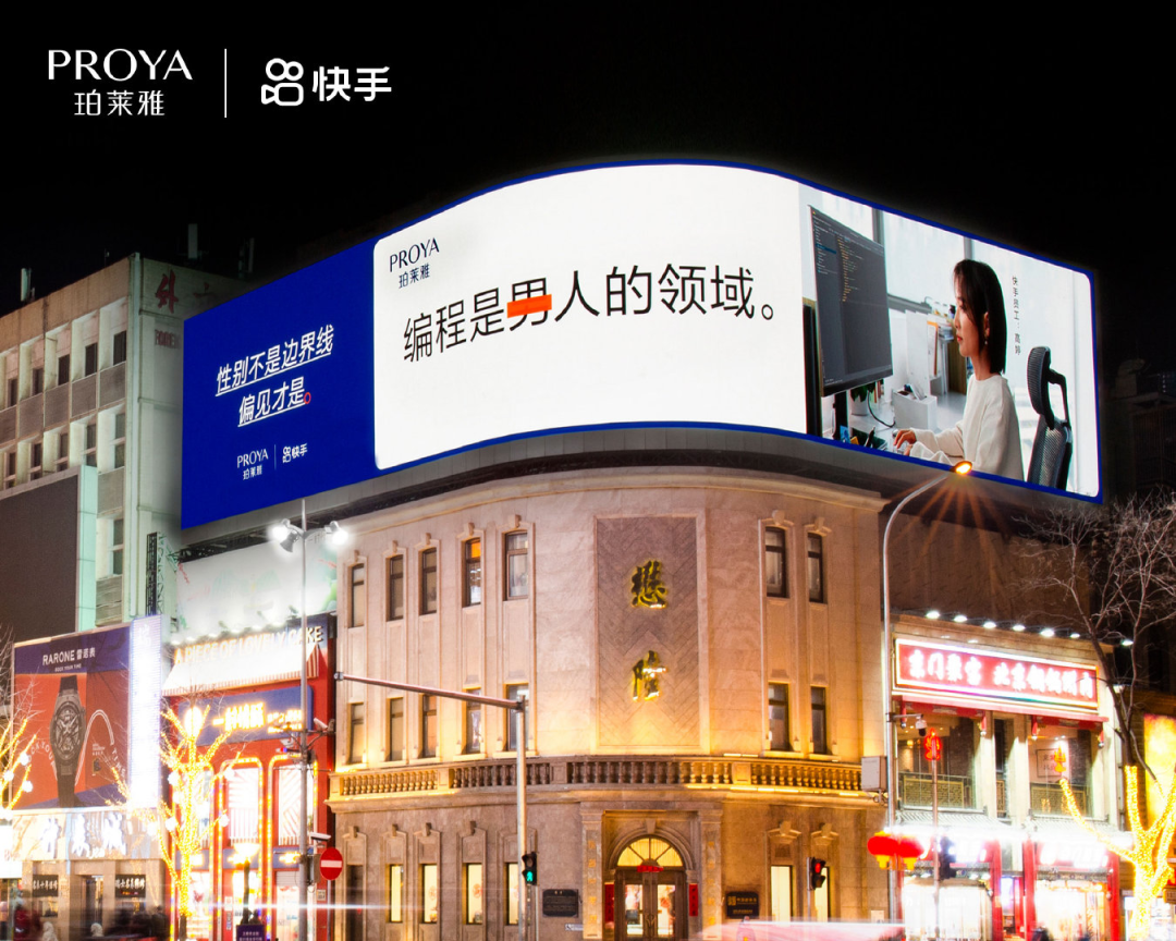 珀莱雅则邀请了Babycare、dresscode、快手、美团外卖等联合发布户外广告,阐述“性别不是边界线,偏见才是”的理念。正如广告文案所说,“玩具没有性别,快乐也是”“如果洗衣机没有性别,为什么在家里使用洗衣机的总是女生”“不是所有在外打拼的「骑手」都是男生。”