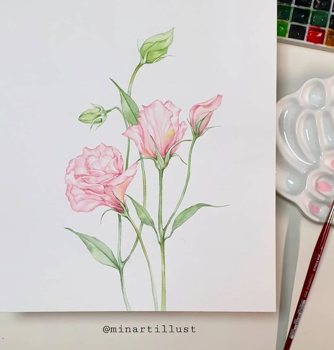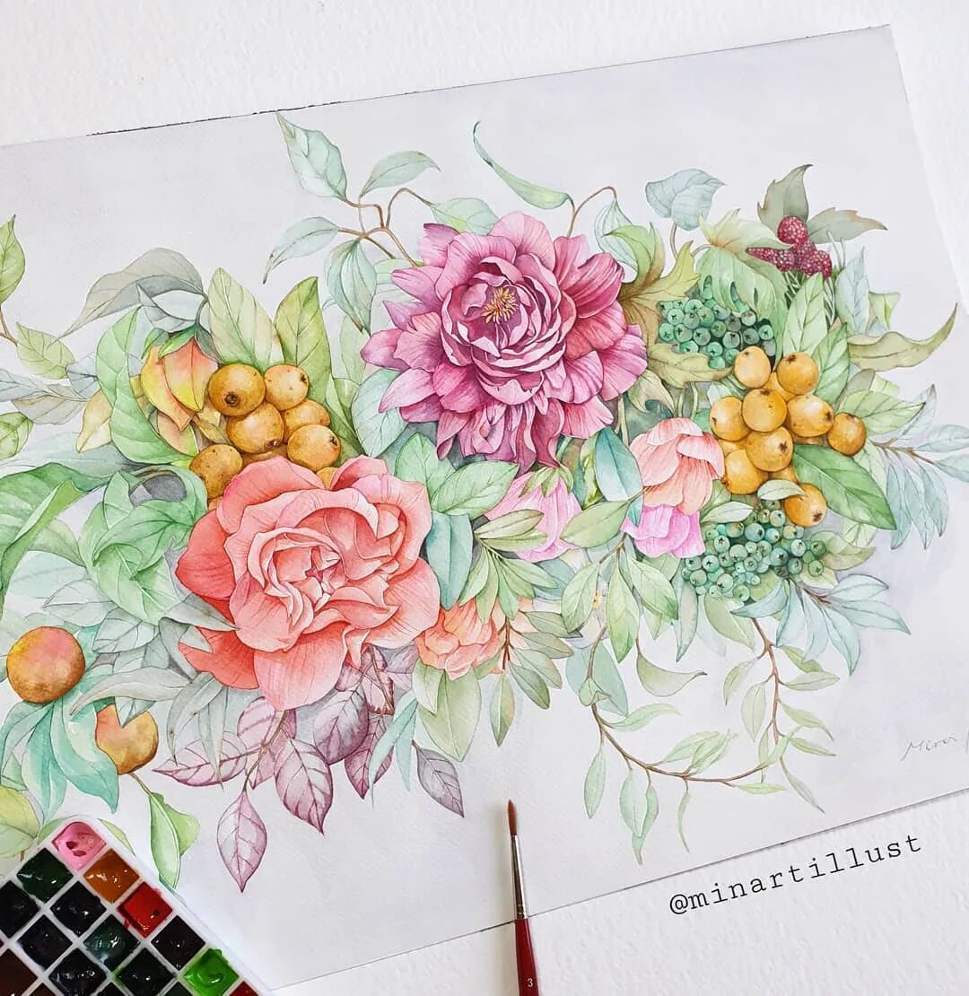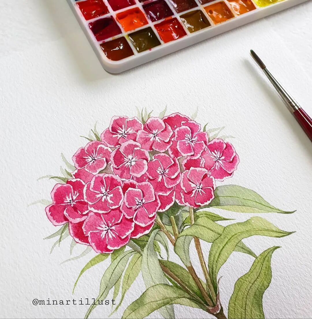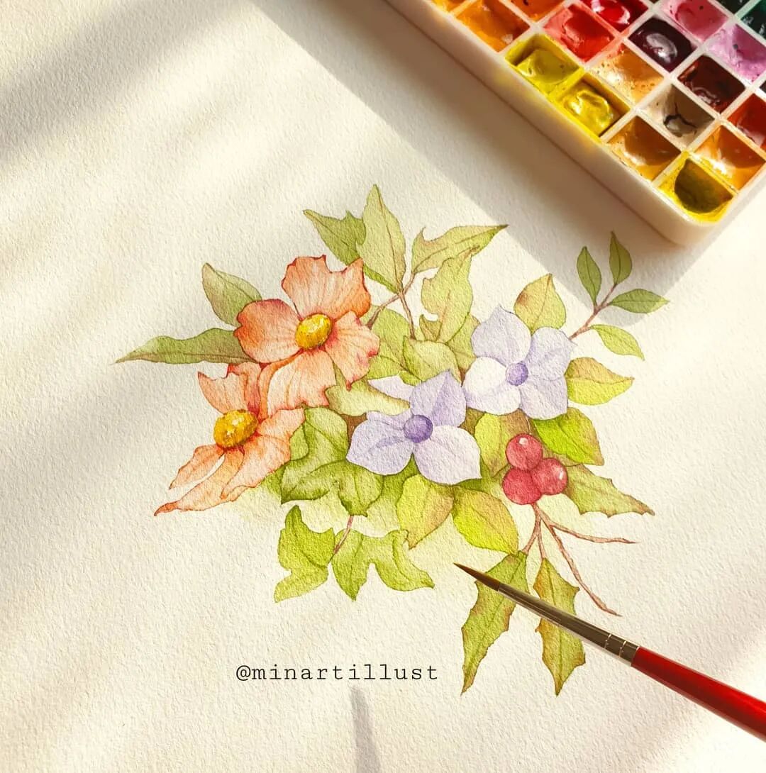 Mina Park Minatu绘制 这些水彩花卉的工具是: 水彩笔和小号的勾线笔、颜料是史明克 她会先把所需颜料挤出放在盘里 再耐心的绘制