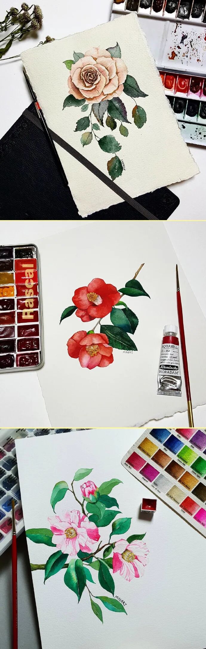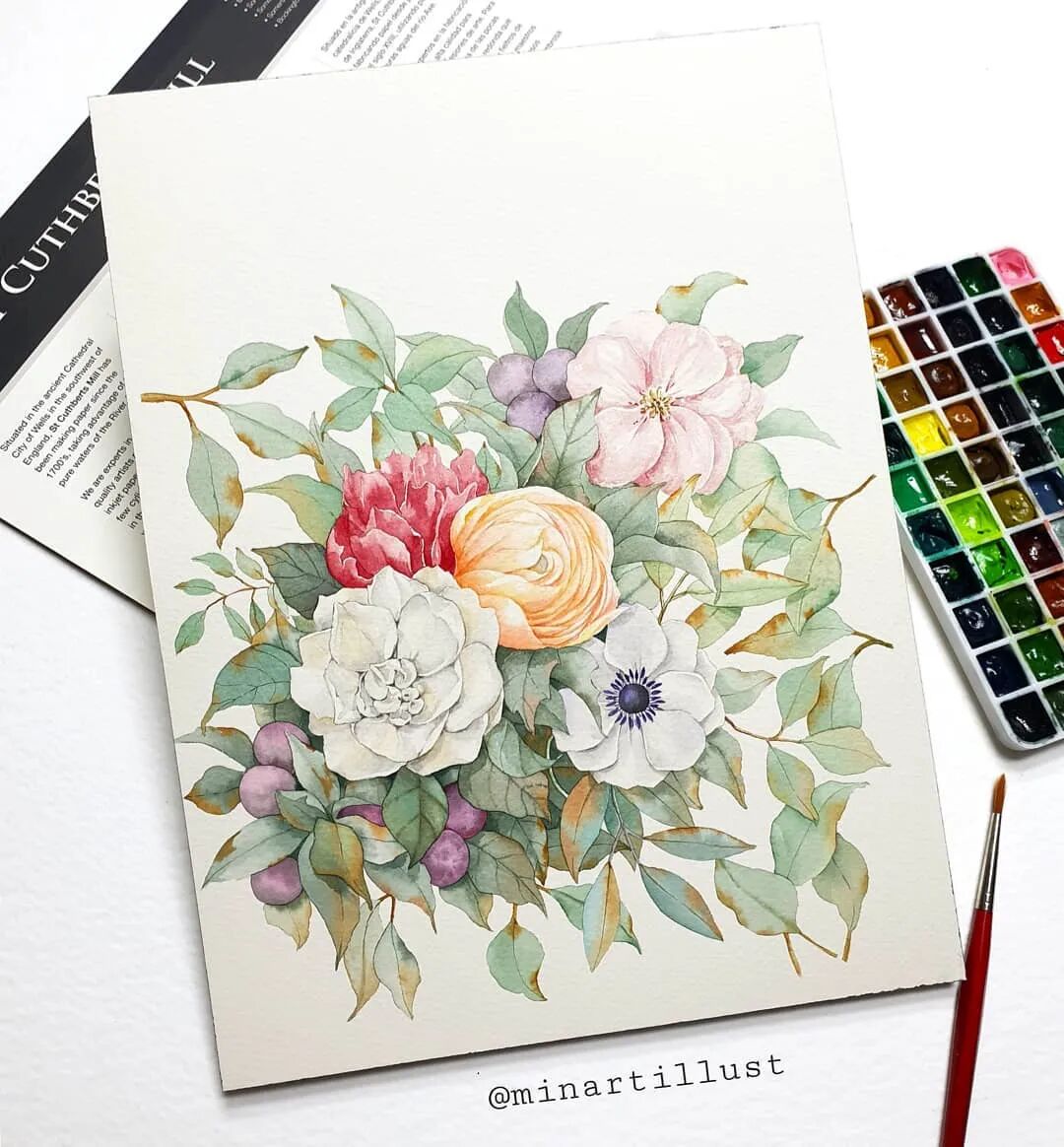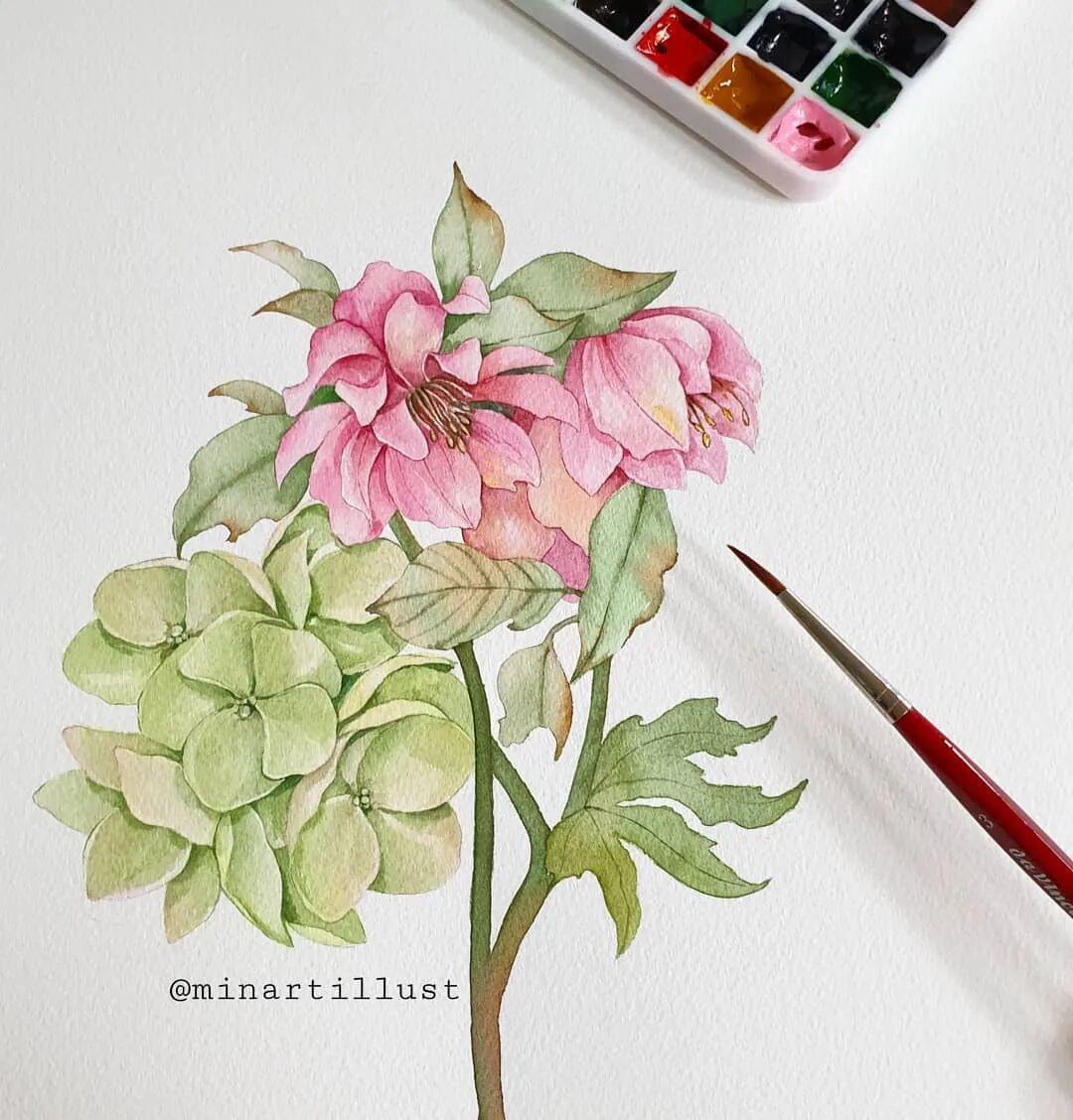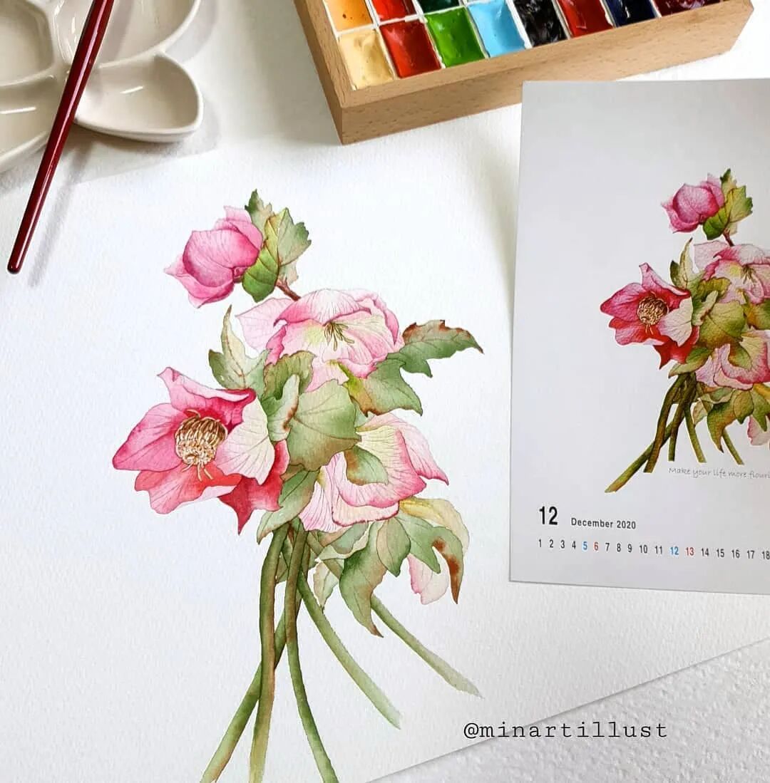 Mina Park Minatu绘制 这些水彩花卉的工具是: 水彩笔和小号的勾线笔、颜料是史明克 她会先把所需颜料挤出放在盘里 再耐心的绘制
