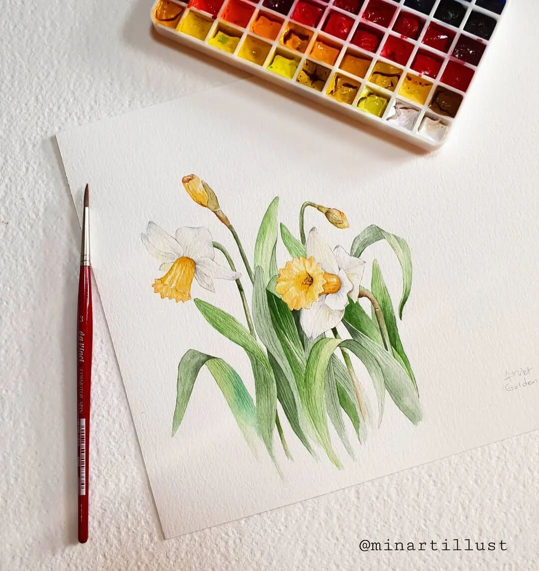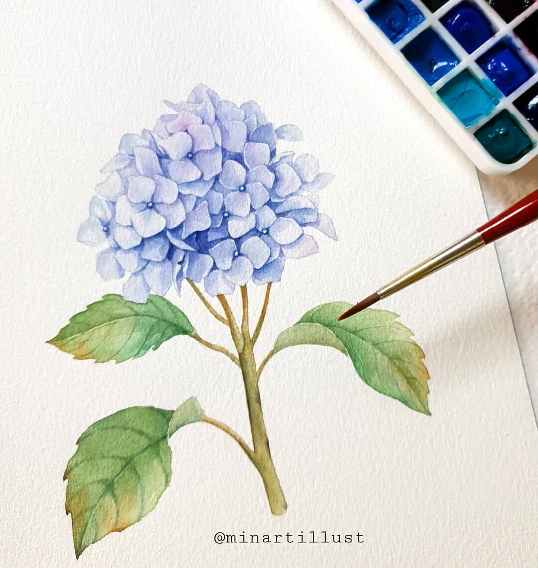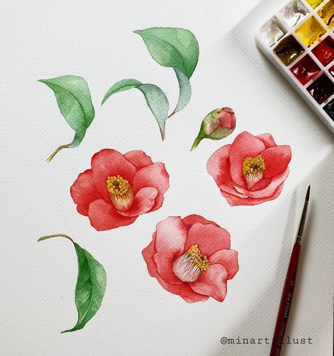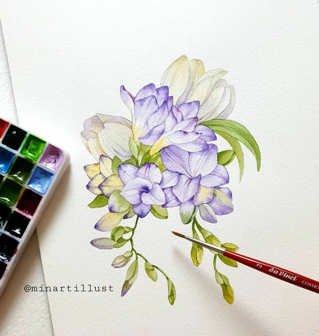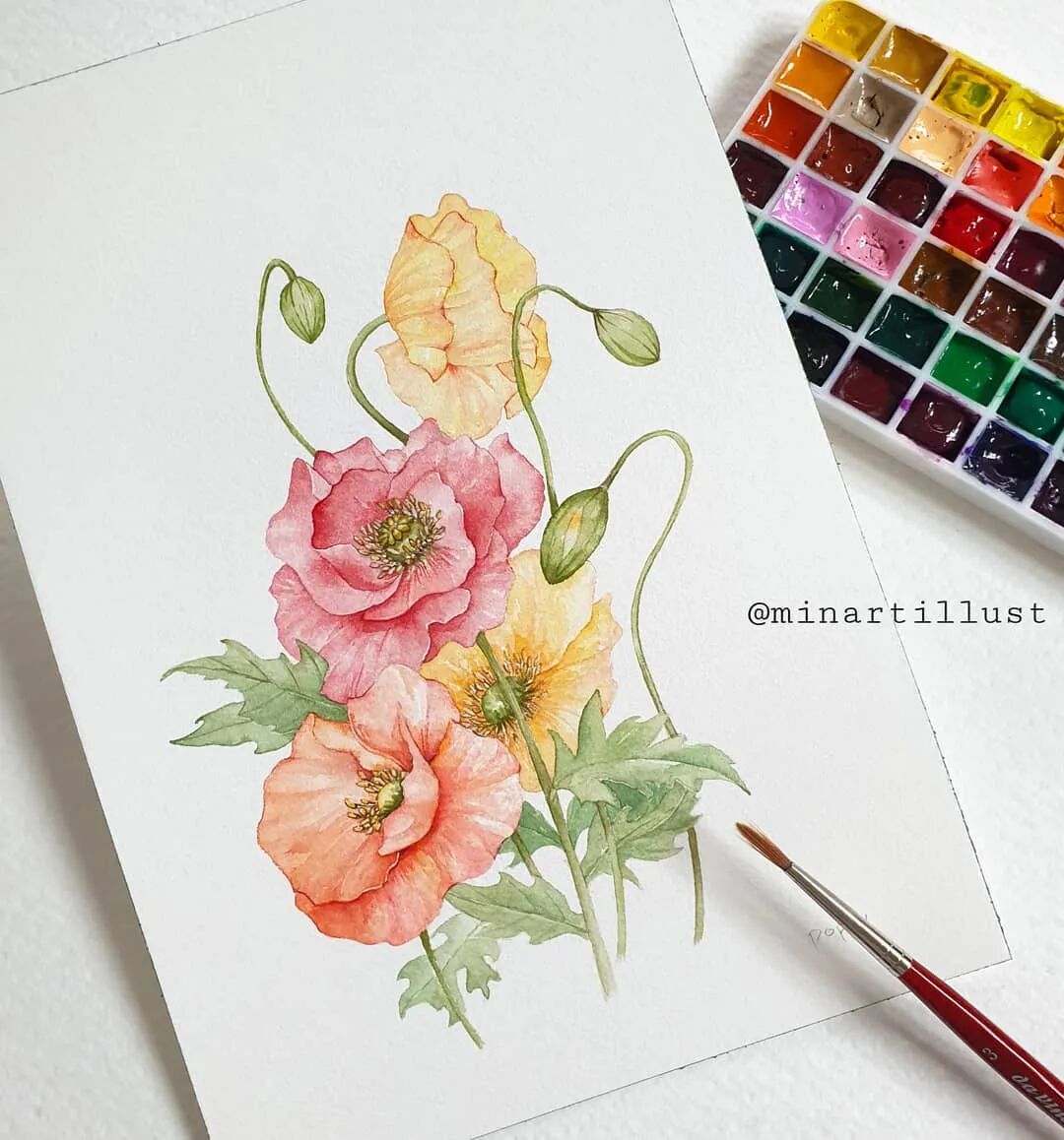 Mina Park Minatu绘制 这些水彩花卉的工具是: 水彩笔和小号的勾线笔、颜料是史明克 她会先把所需颜料挤出放在盘里 再耐心的绘制
