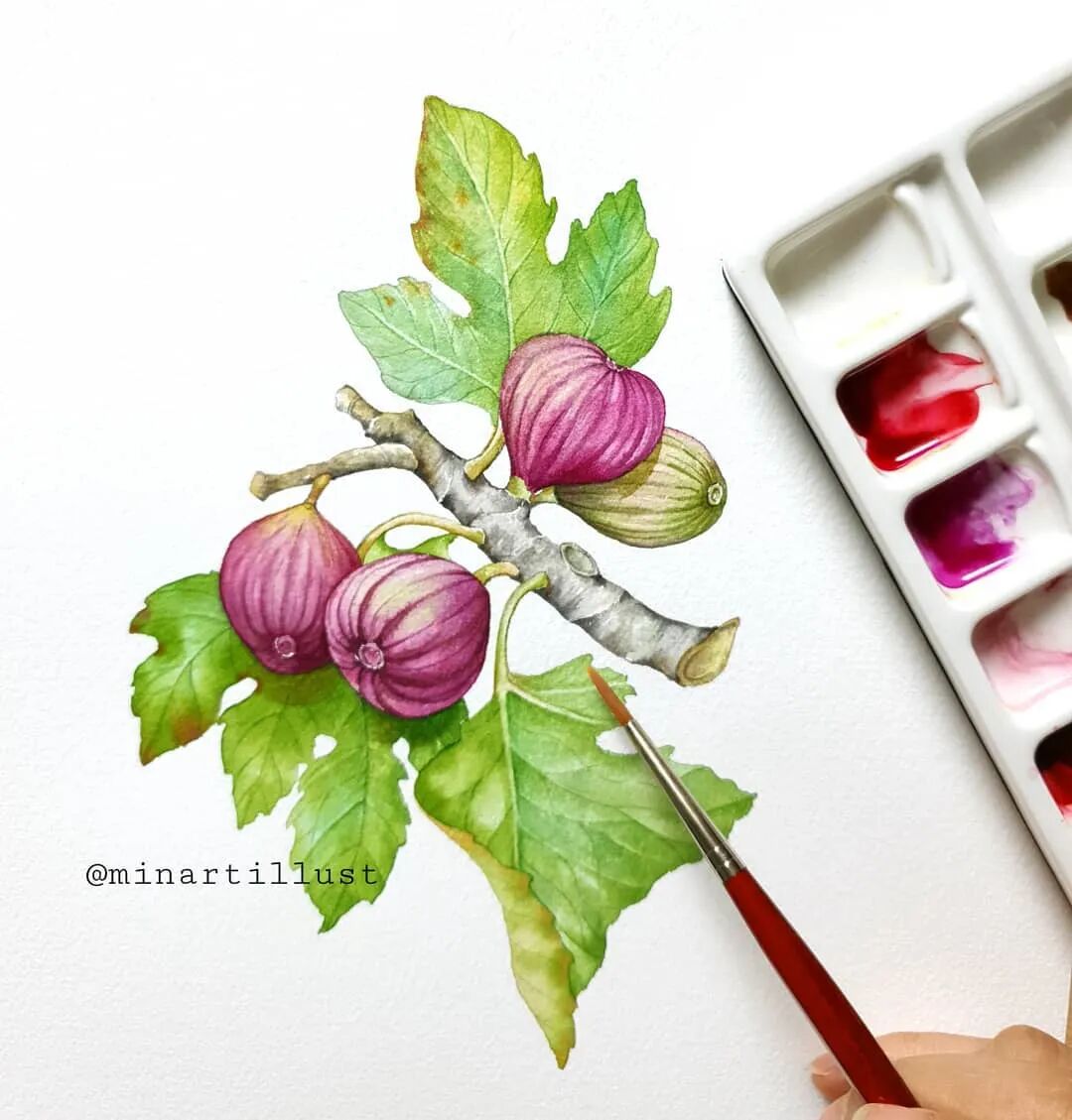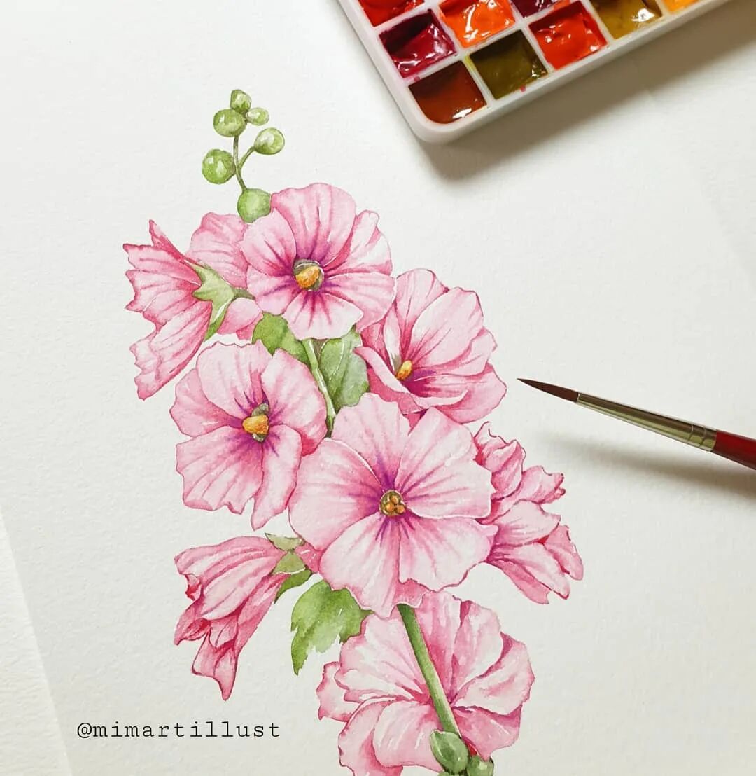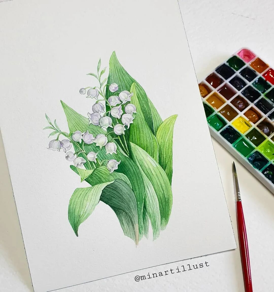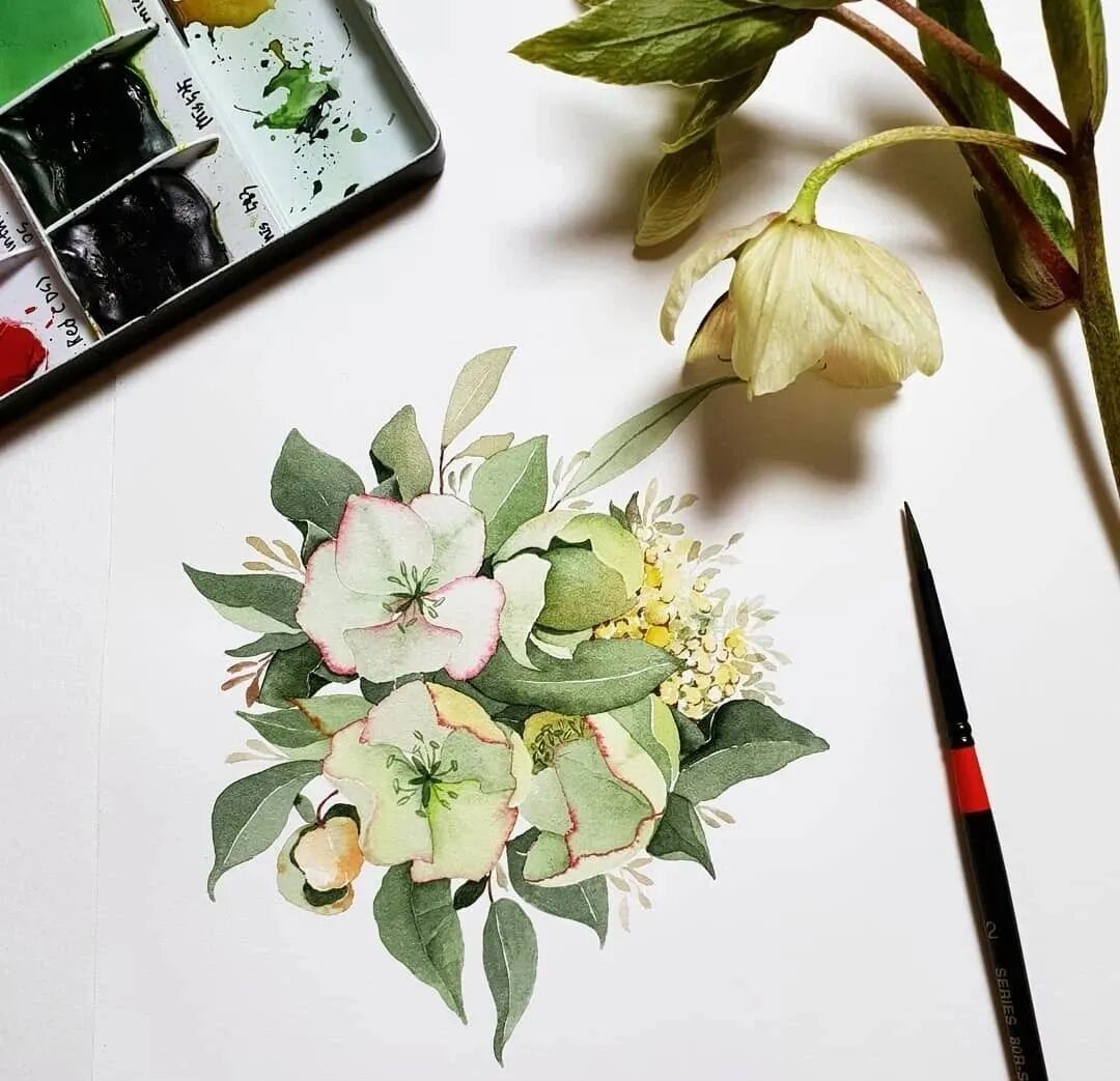 Mina Park Minatu绘制 这些水彩花卉的工具是: 水彩笔和小号的勾线笔、颜料是史明克 她会先把所需颜料挤出放在盘里 再耐心的绘制
