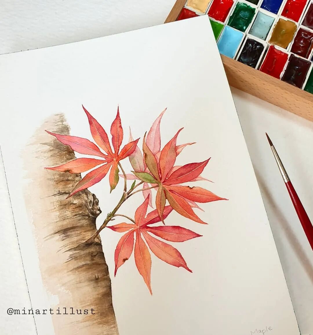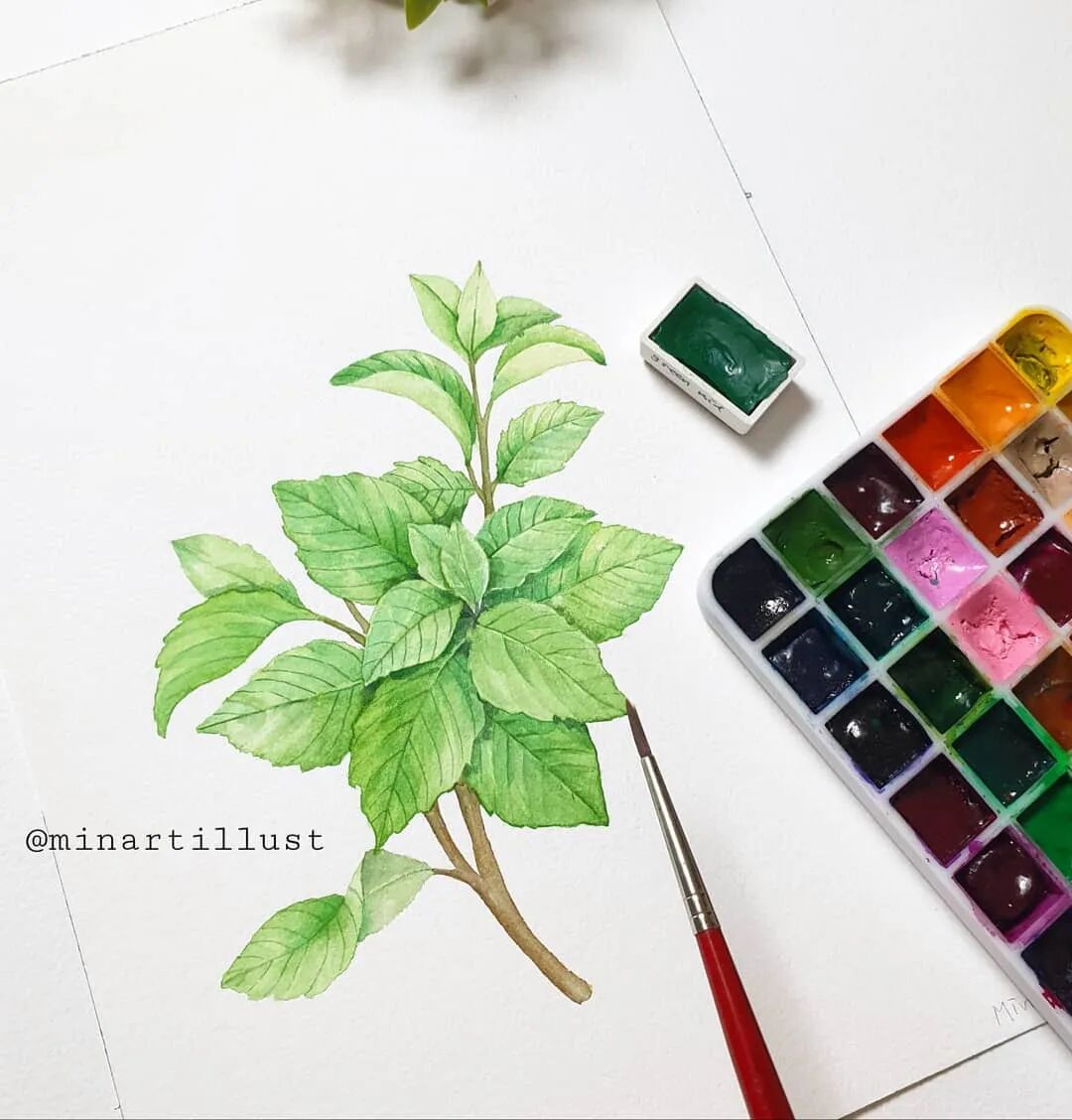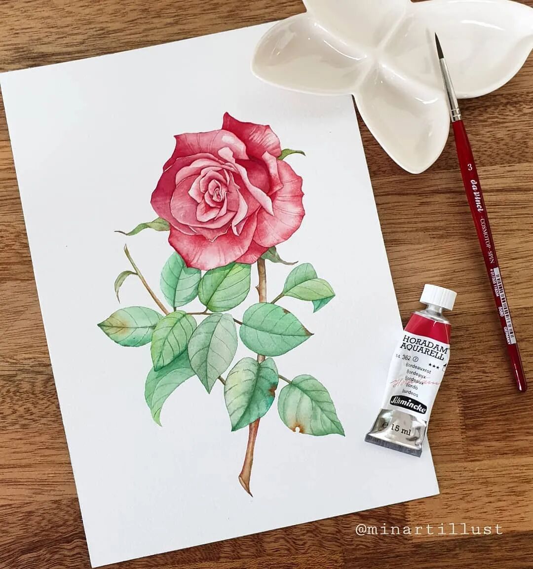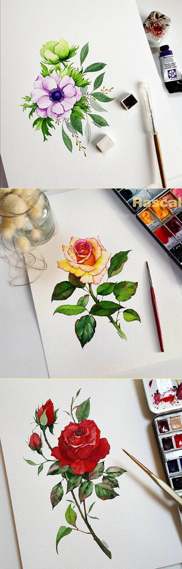 Mina Park Minatu绘制 这些水彩花卉的工具是: 水彩笔和小号的勾线笔、颜料是史明克 她会先把所需颜料挤出放在盘里 再耐心的绘制