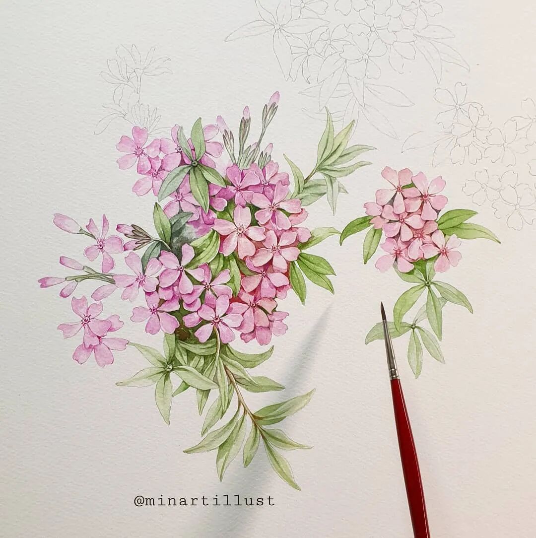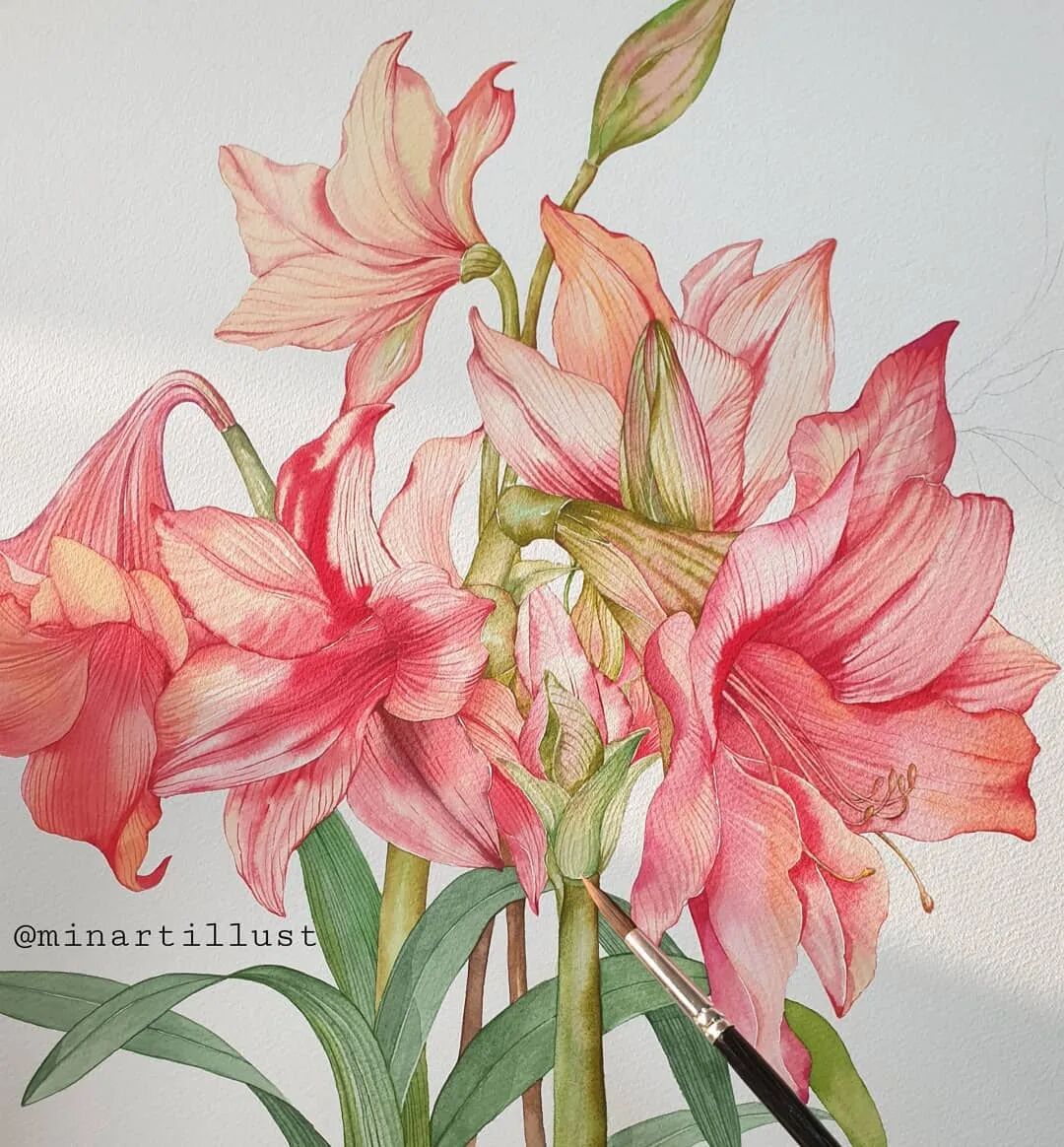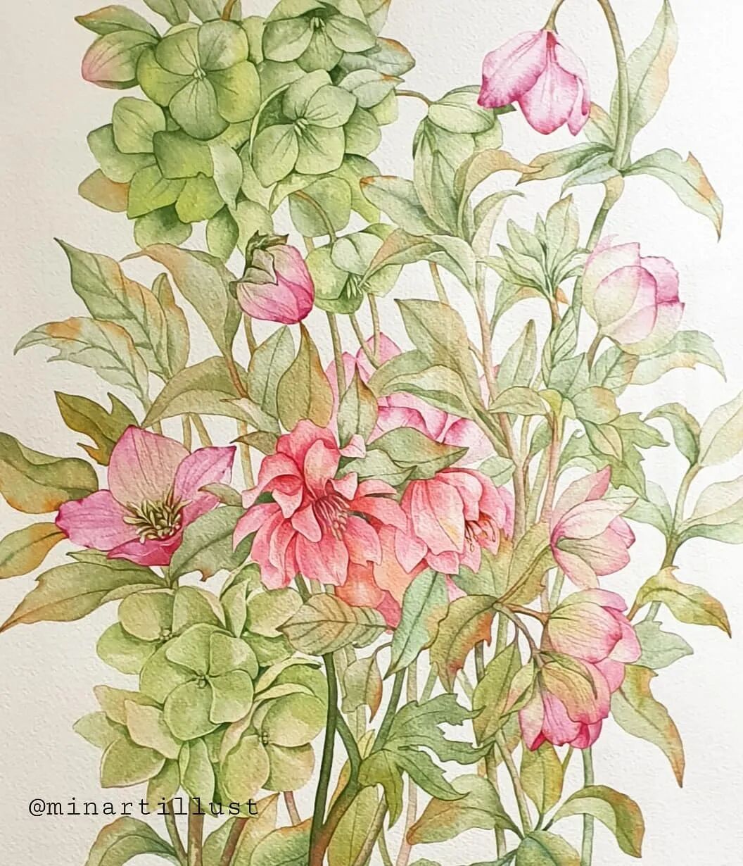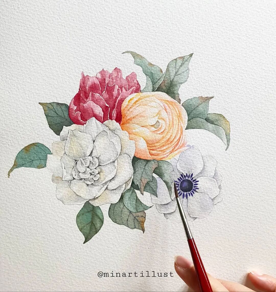 Mina Park Minatu画画非常有耐心 描绘的每一层花瓣,都很有层次 细腻且看不到一丝笔触 颜色干净、通透,简直美极了~