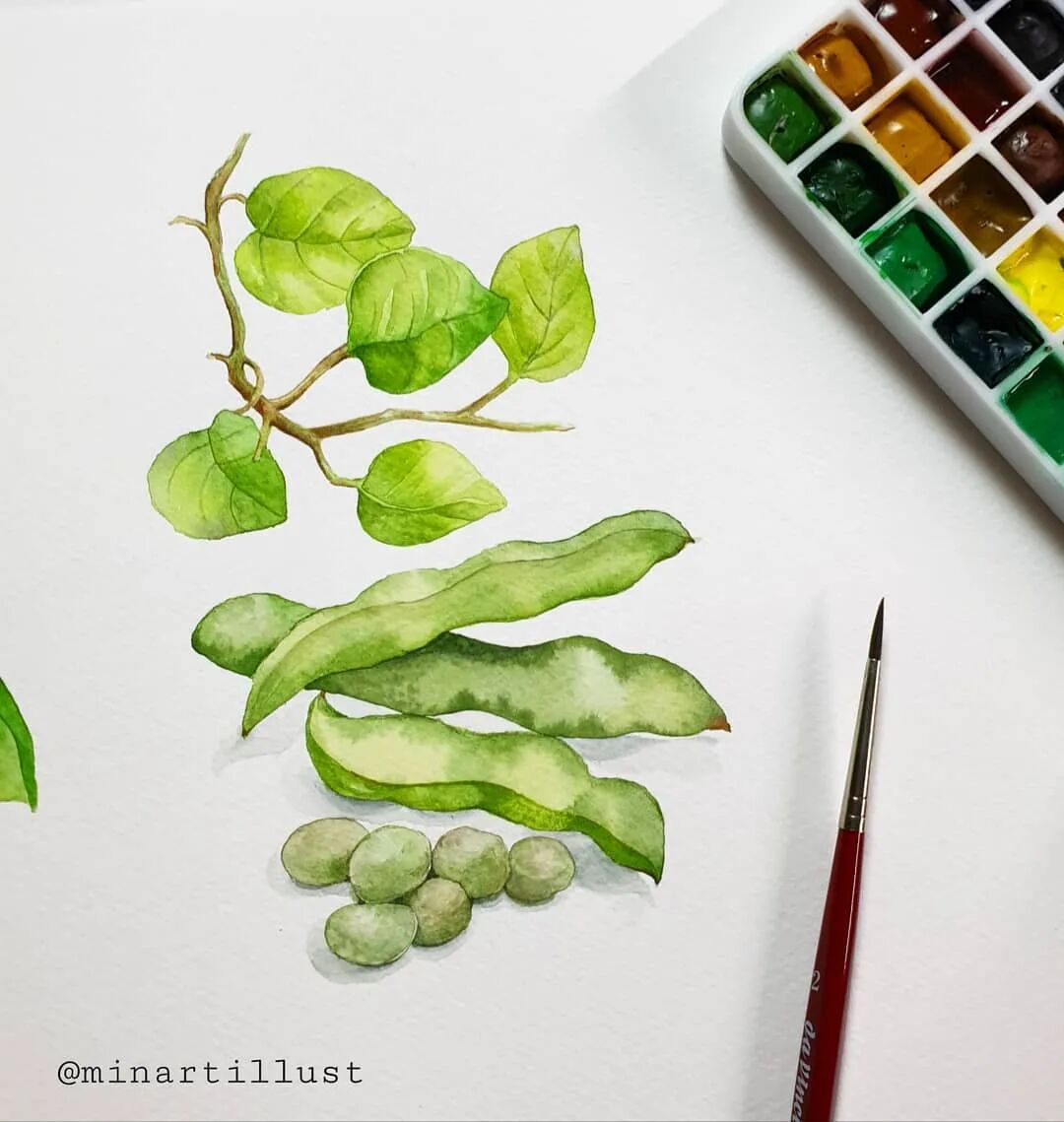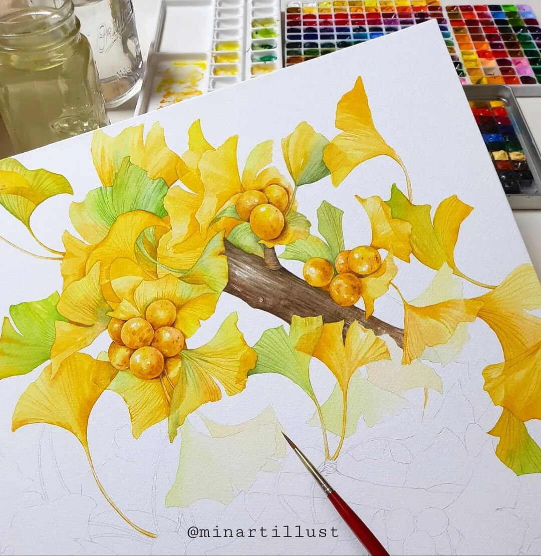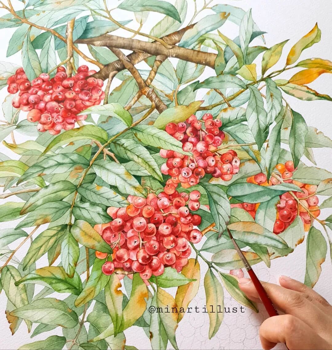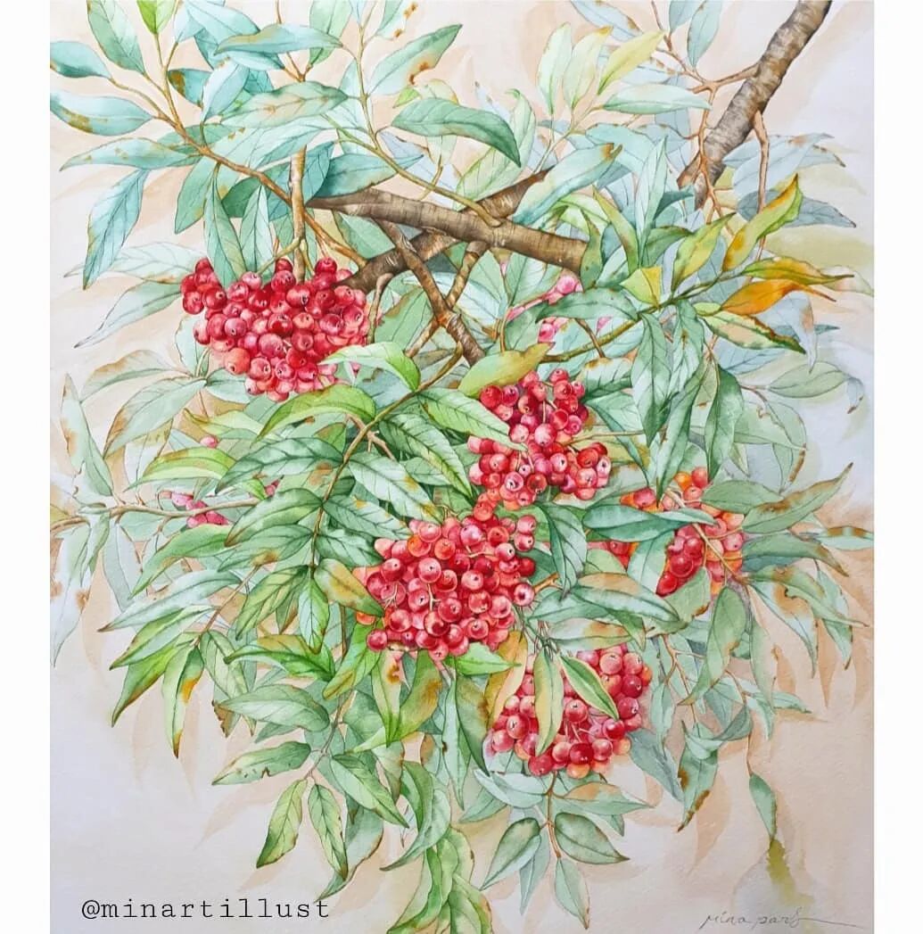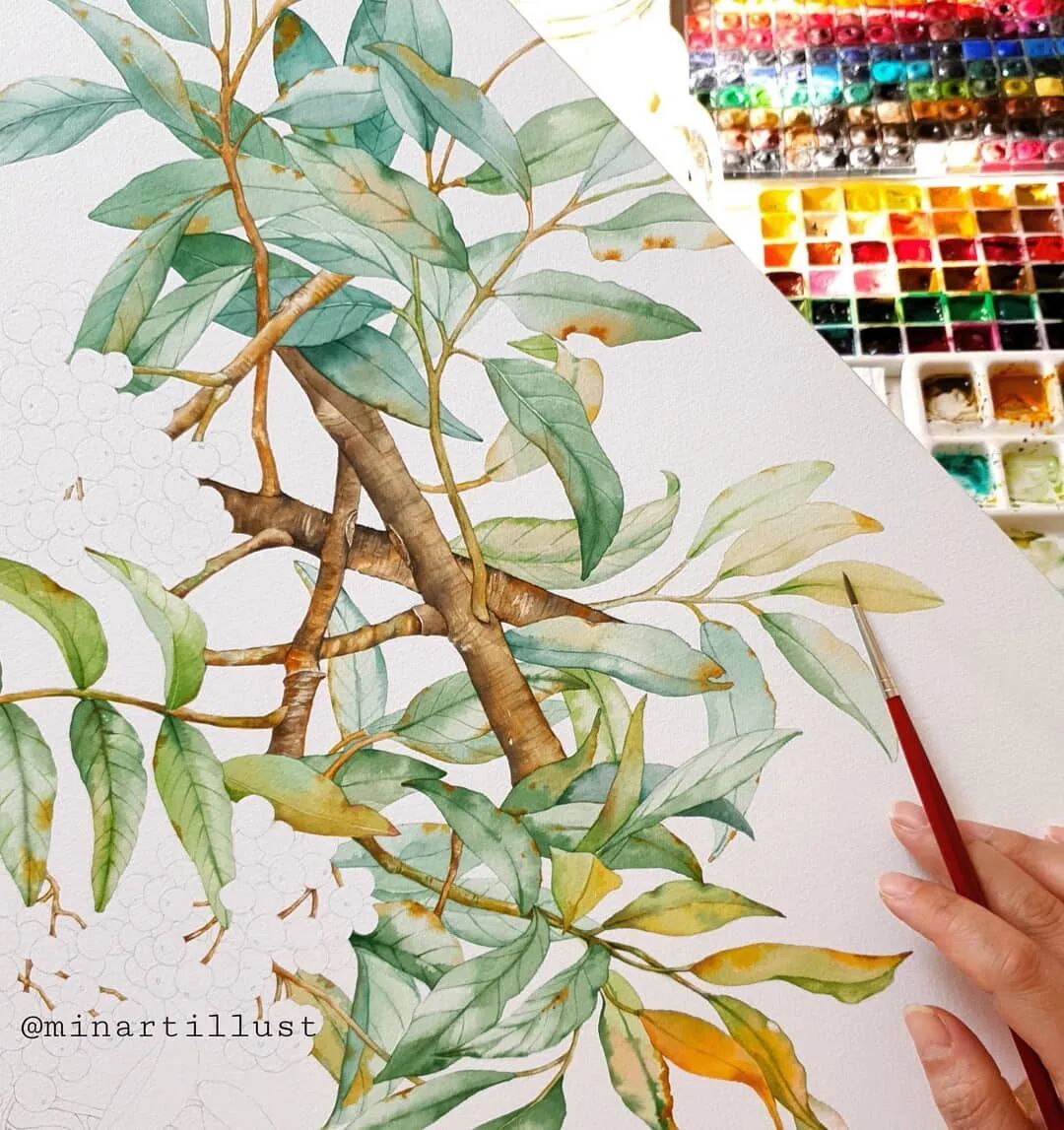 从前面的绘画步骤,我们可以知道: Mina Park Minatu会先用铅笔 浅浅的把植物花卉的形体勾勒出来 再紧接着用水彩一层层的上色