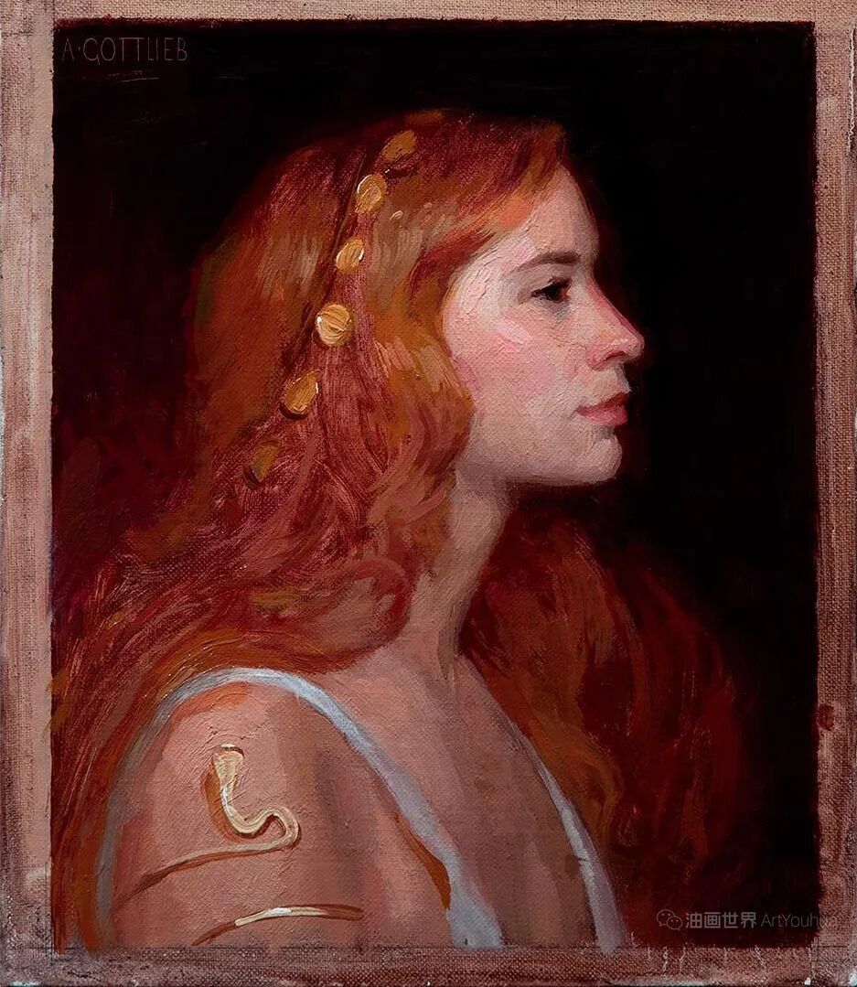 阿德里安·戈特利布画了许多出色的具象作品,尤其是肖像画和风俗画。他是一个肖像画家,视野是如此的敏锐和深刻,以至于似乎看到了模特的灵魂。戈特利布的作品直接取材于现场模特,避免使用照片,因为照片缺乏他所说的“生命力”。在他的肖像中,我们不知何故看到了永恒本身。我们偶尔都会有意识增强的闪现,但戈特利布似乎一直在这个水平上运作。