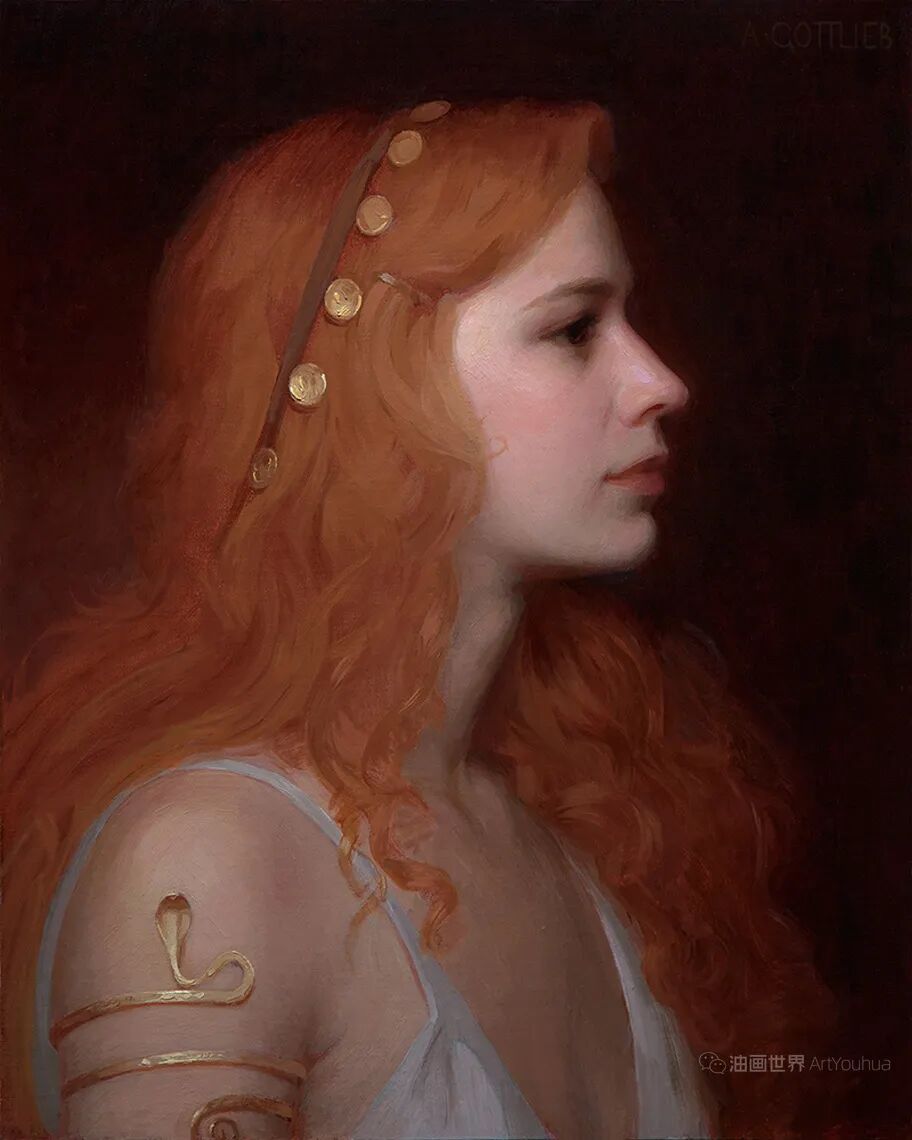 蔚蓝的颜色暗示着晴朗的蓝天,航行在地中海,一种和平与宁静的感觉。蓝色丝带轻轻地盘旋在她上翘的头发上,她显得安详、优雅、沉稳。在这幅人物画中,戈特利布通过在花卉图案的深色背景下突出她的鹰钩线轮廓和长颈,强调了他的主题的经典女性美。一只金色的asp缠绕在她的手臂上,唤起了对埃及艳后的记忆,埃及艳后是力量、智慧和美丽的象征。