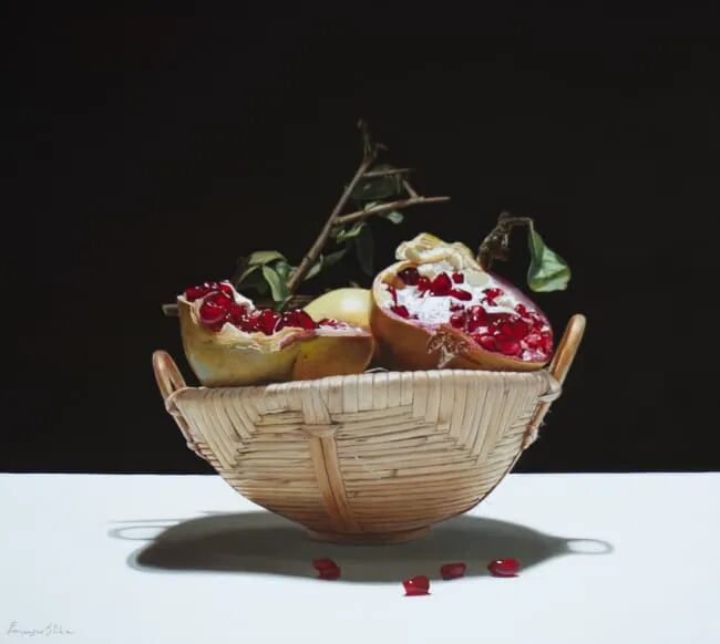 这位超写实艺术家画笔下的水果,每一颗都十分真实,弗朗西斯科·斯蒂尔最擅长的,不是新鲜的水果,而是放置时间很久,有了疤痕和褶皱的,这样的静物更能体现艺术家对细节的捕捉和刻画。还有被掰成两半的桔子、石榴等,粒粒分明,根根纤维也十分逼真。最终呈现出的作品,让人十分服气。
