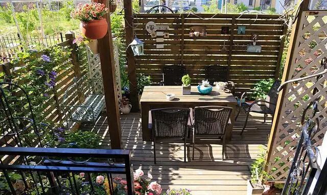 可以晒着太阳,喝一杯下午茶,身旁的木格栅上,