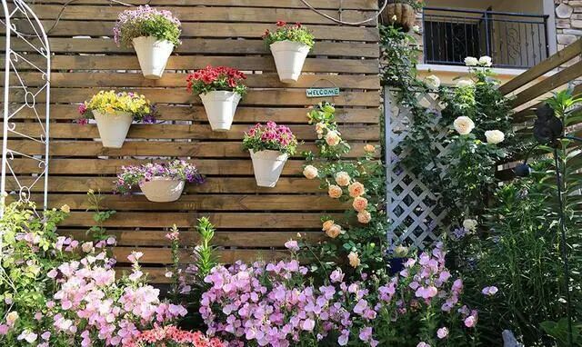 并且还利用了木栅栏的空间,在上方种植了许多观花植物,比如矮牵牛以及天竺葵,这些花期漫长的盆花,让花园一年四时都显得鲜艳美好。
