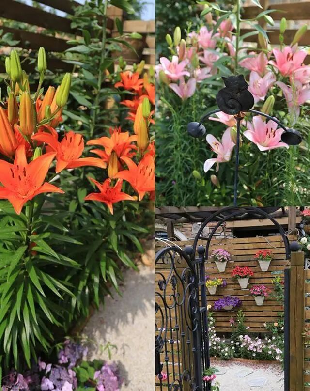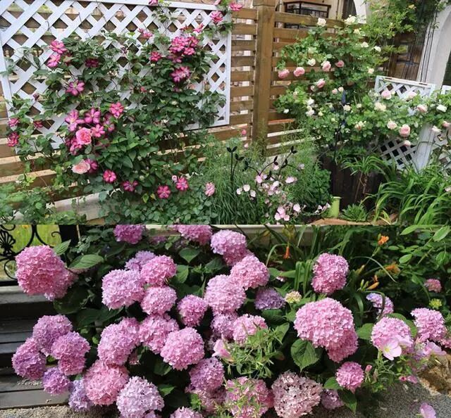 在花园的基础结构改造完成之中,就是花园里的植物布置。所有的格栅周围,都种植了不同色系的爬藤月季和铁线莲。同时在中间的空余位置,还种植了许多百合、萱草、绣球花以及月见草等植物,比较好照顾和打理,只要入冬时,修剪清理枯枝,来年又会盛放。