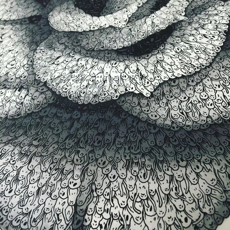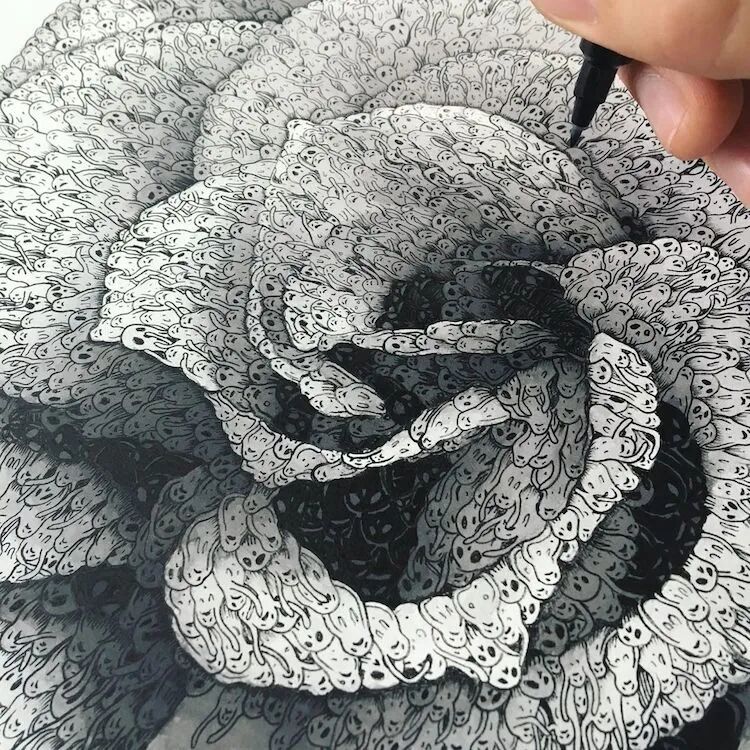这位英国艺术家以幽灵为元素,将众多的小幽灵聚集在一起,创作出异想天开错综复杂的图案,尤其是一朵数千个“迷失的小幽灵”组成的复杂玫瑰,最让人印象深刻。除了玫瑰花之外,理查德·伯纳还利用富有表现力的幽灵元素,来构建其他的主题,比如仿照世界名画、花朵、蝴蝶等等。