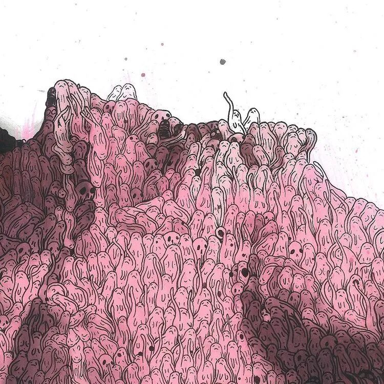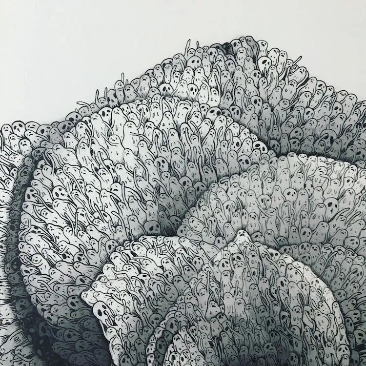 这种复杂的幽灵绘画,充满了莫名的幽默感和讽刺感,谁能想到,在这位艺术家上大学时期,他的导师曾经亲口告诉他,画这种奇怪的小幽灵没有任何前途,也让他一度想放弃这种形式的绘画,等到大学毕业后,再没有人能限制他,这些小幽灵再次“复活”。