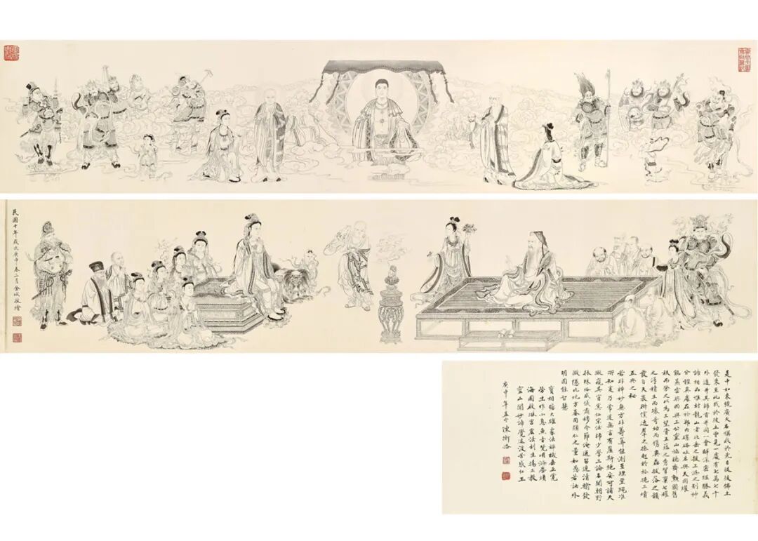 卷尾为金城的相知挚友陈衡恪题跋,为呼应《佛说维摩诘经》构图,乃取中国著名碑、帖、经文等经典作品之段落,相辅相成,烘托出独树一帜、耐人寻味的艺术美感。