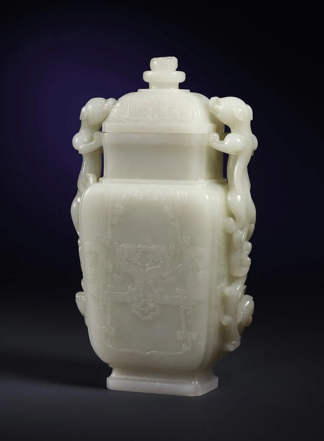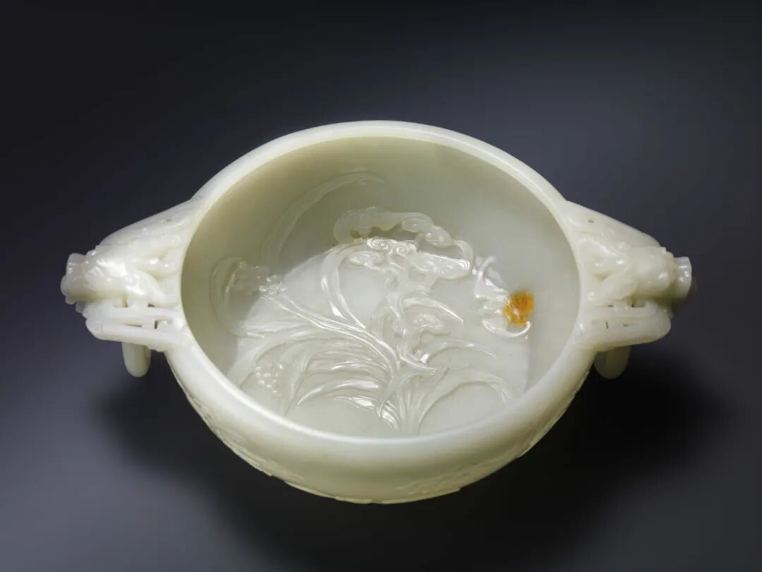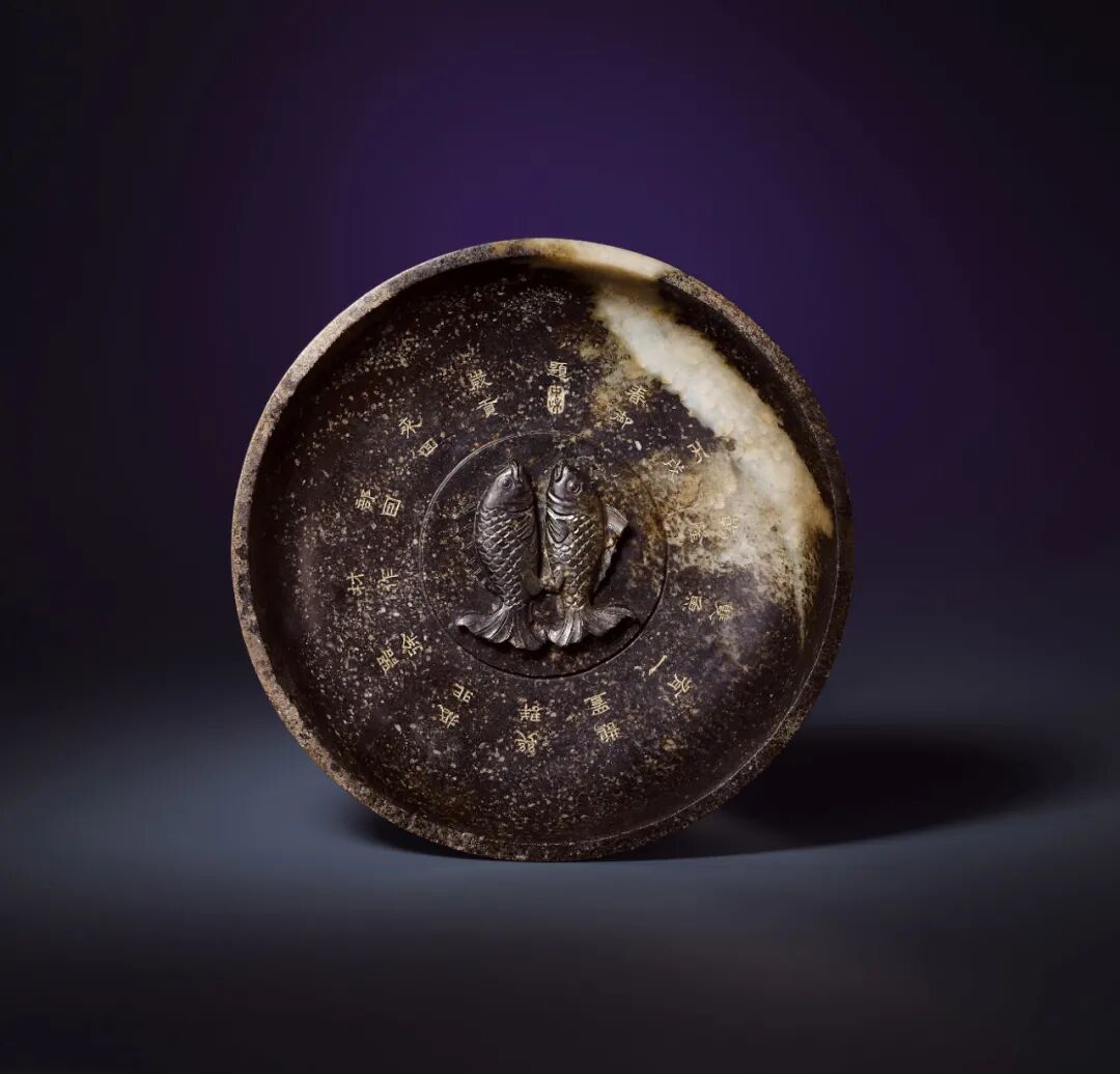本次呈献佳品如清乾隆〈白玉仿古御题诗双鱼盘〉,底部贴有「字第三百二十」黄签,或原为清宫陈设,或收储于内廷。盘之纹饰及布局参照汉代青铜器形制再加以变化,于盘心浮雕对称双鱼,且镌有填金隶书御题诗,诗文与构图相呼应,显露乾隆皇帝对此盘的喜爱之情。