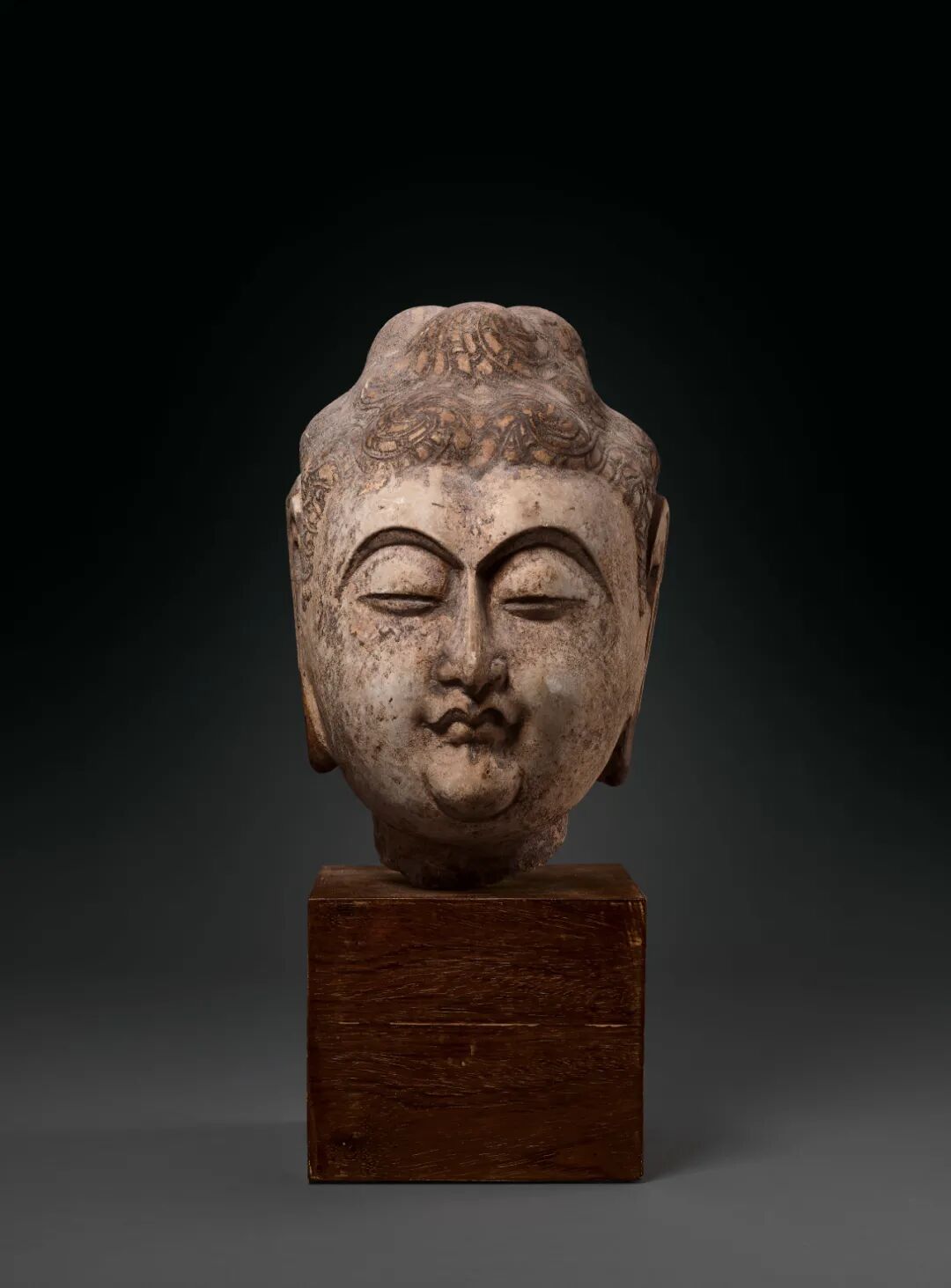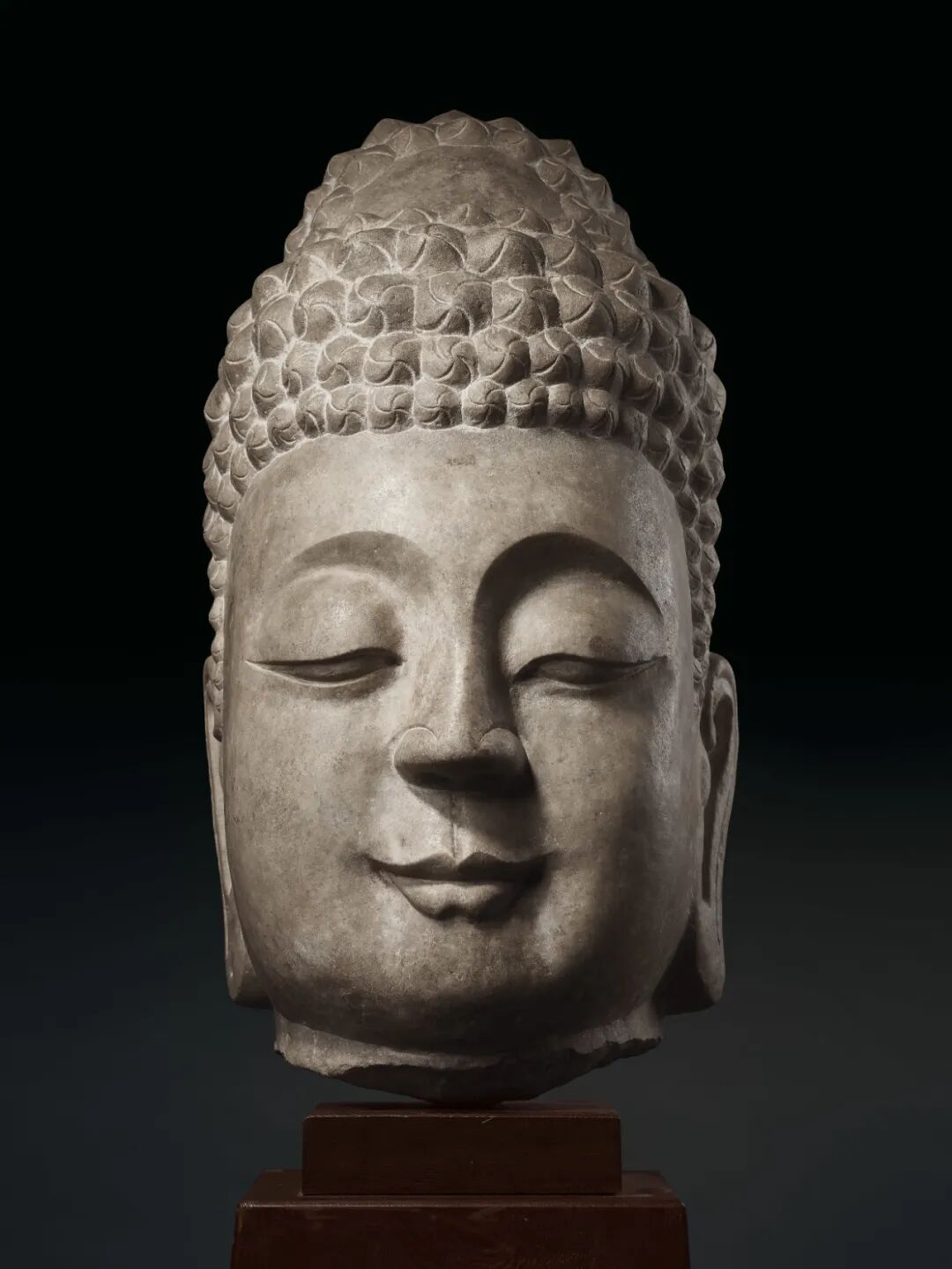 由知名旅美佛像收藏家陈哲敬所藏北齐〈大理石佛首〉,曾于1984至1988年展览于国立历史博物馆,并于1989年出版《中国古佛雕:哲敬堂珍藏选辑》中。佛首脸型浑圆丰润,顶部发髻隆起,雕饰的花纹随形态而转动,尤其发式极其罕,完整展现北齐佛教艺术特色,更代表着高水准的佛教雕塑工艺。