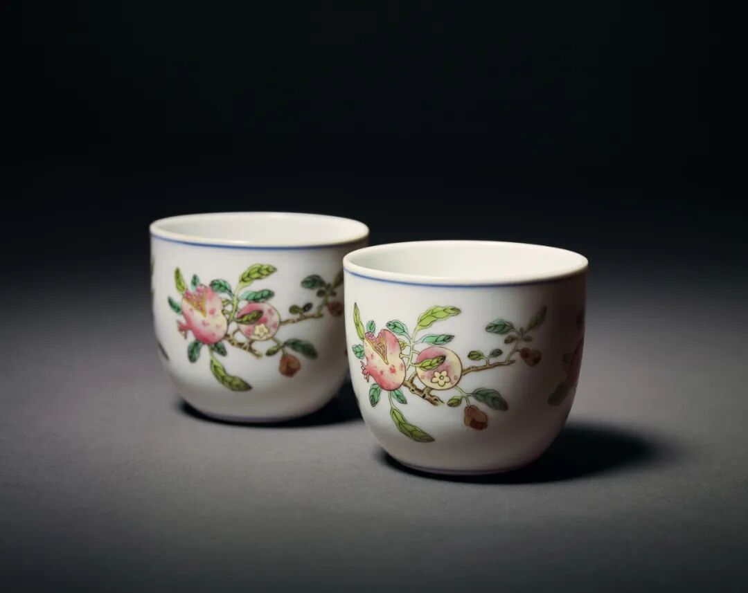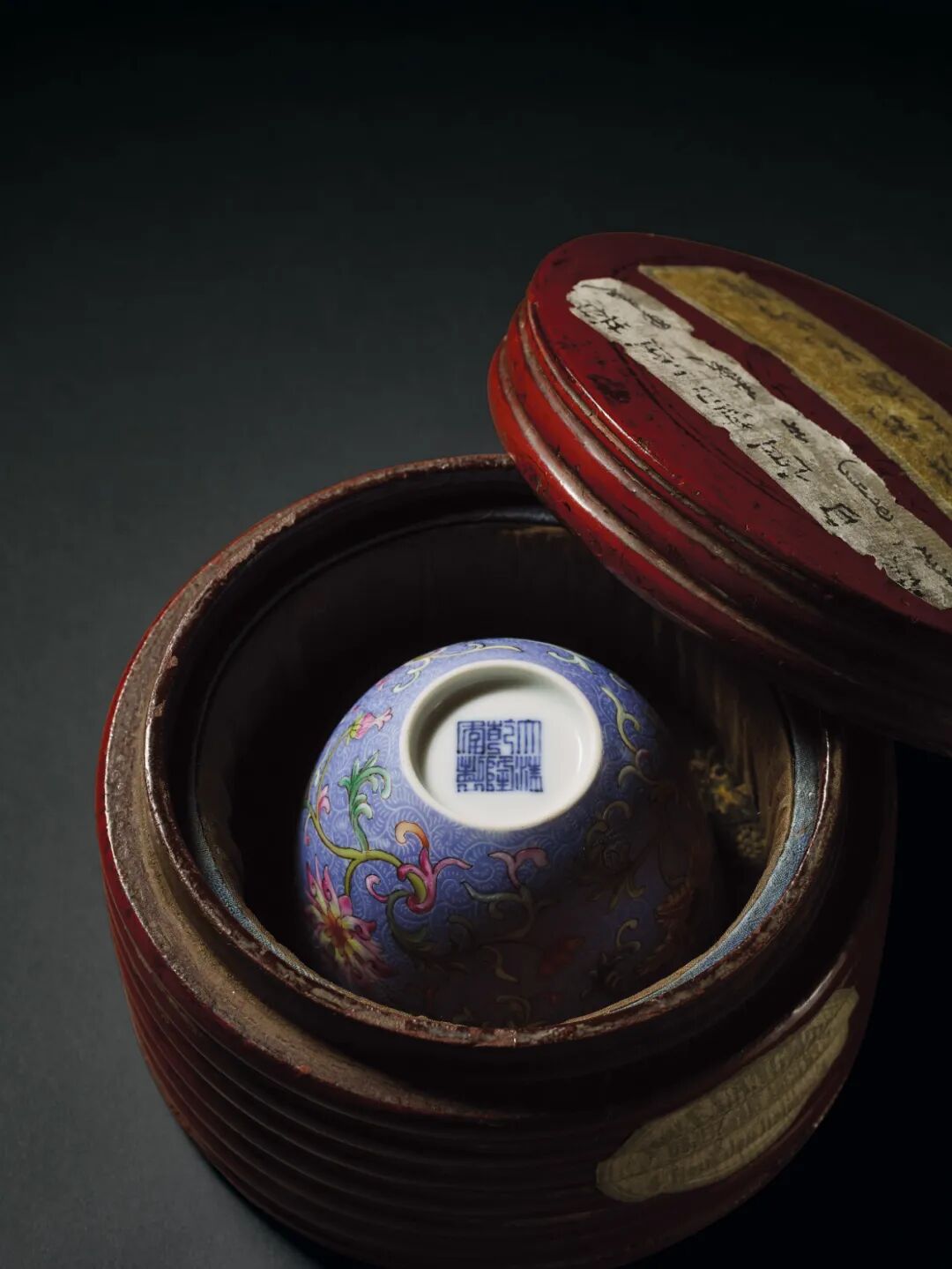 器底青花「大清乾隆年制」三行六字篆书款。配有原装漆盒,贴有黄签「磁胎洋彩翠地锦上添花茶钟」及写有汉、满文「交四宜书屋备」之签条,可知本品原应收储于圆明园四宜书屋。并附巴黎朗威尔艺廊收据,其信封以法文写到本品为「一个来自中国北京,皇家夏季宫殿的杯子」,来历尊荣不凡。