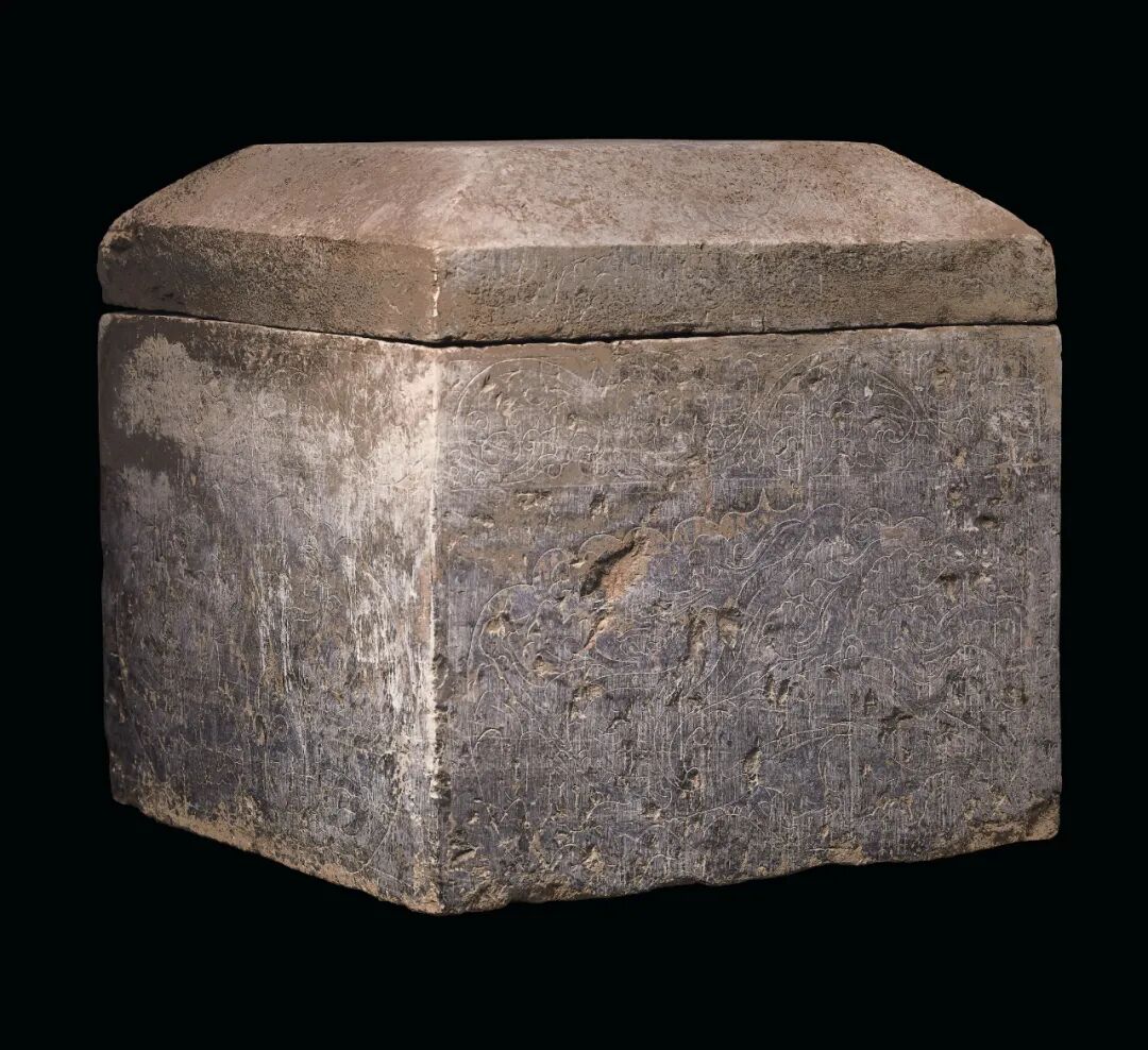 唐〈石灰岩四神兽纹舍利函〉,是以纳藏珍贵舍利及圣物。盖面饰二方连续排列式卷草纹,象征佛教轮回。函身四周饰青龙、白虎、朱雀、玄武四神兽,借以护卫函内舍利,是为唐代佛教艺术的精美作品。