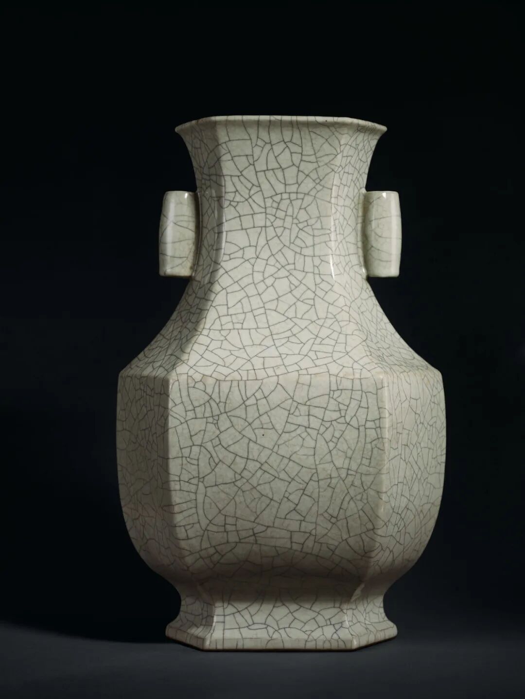 烧造此种恢弘器皿,对烧造时的火候控制极为严苛,显见制作技艺之高超。以淡恬柔美仿哥釉搭配六方硬朗造形,刚柔并济,于穆穆中透出对宋人雅器之钦慕,师古而不泥于古,诚属乾隆仿哥釉瓷之翘楚。