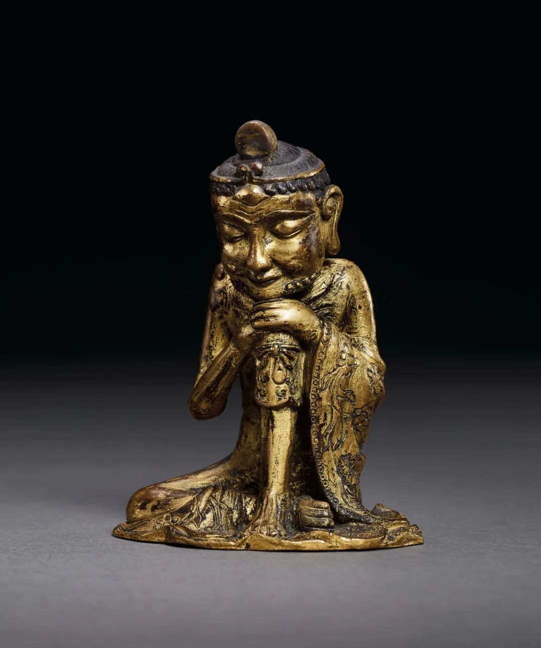 明〈铜鎏金雪山大士坐像〉,大士相貌奇古,半裸上身,斜披巾錾刻缠枝花卉,既保留古希腊及犍陀罗遗风,又融合藏传佛教造像的审美元素,淋漓尽致地显现明代佛家至高的「止息散心,专注一境」禅定气象。