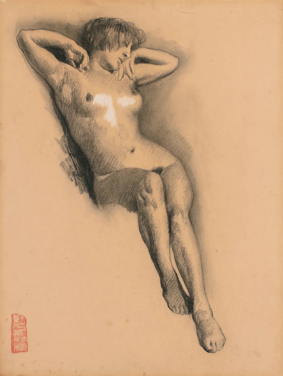 另件由刘艺斯珍藏徐悲鸿〈梦〉,曾上拍于台湾苏富比1994年秋拍,著录于四川美术出版《悲鸿画选》中。作品以炭笔素描表现裸女呈斜倚之姿,以精炼有力的线条勾勒女体轮廓,笔笔准确,结构严谨,展现艺术家深厚纯熟的艺术功力。