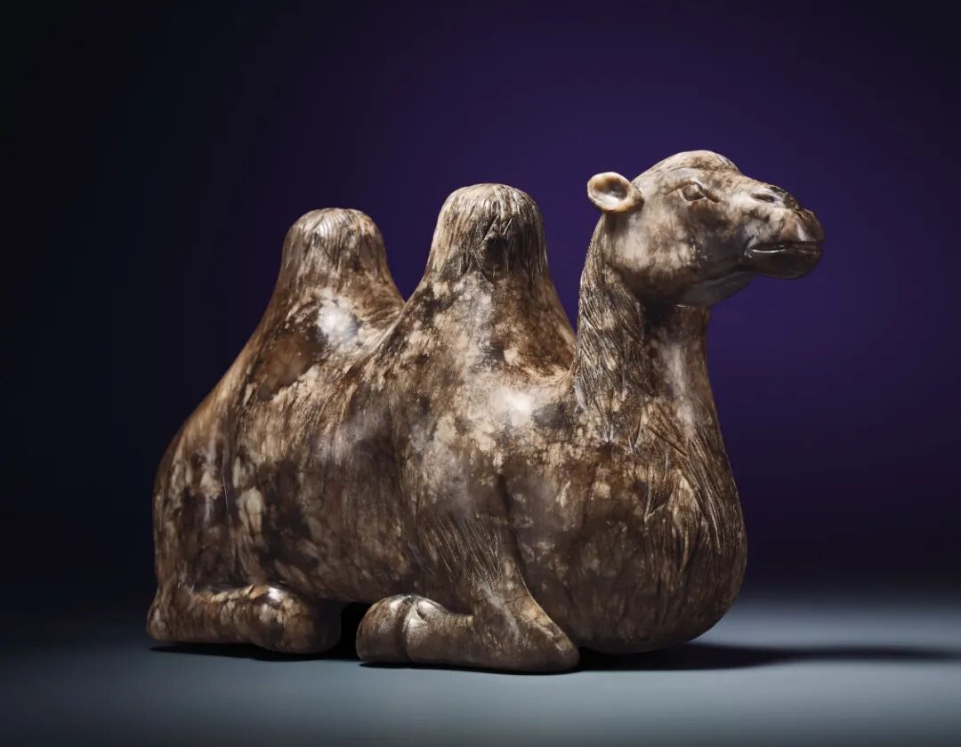 本件白玉提油骆驼不仅尺寸硕大,色泽莹润,造形饱满厚实,比例准确,身躯多处浅刻细短线条,以示披覆的皮毛,肌肉起伏明显,维妙维肖,置之文房桌案,充盈别样情趣。