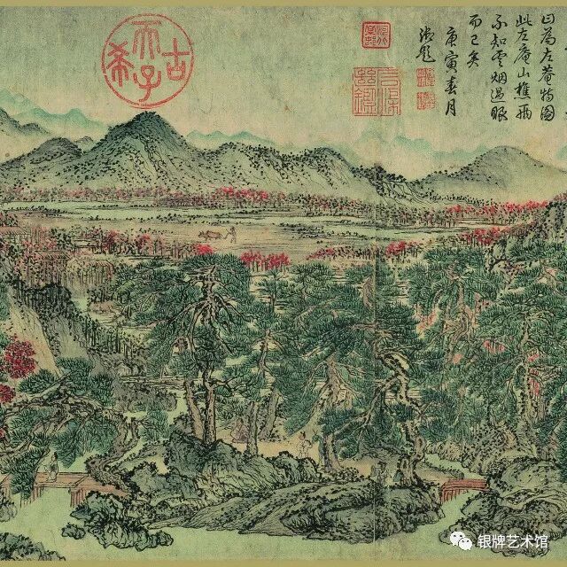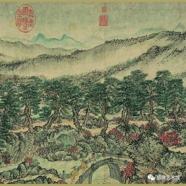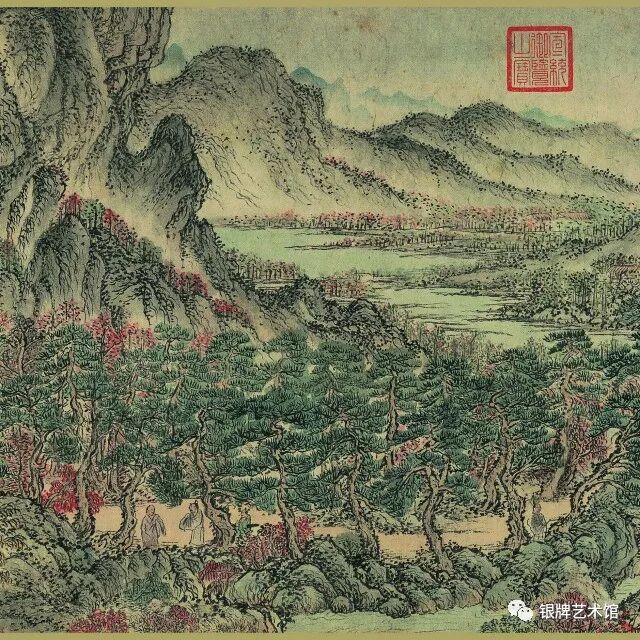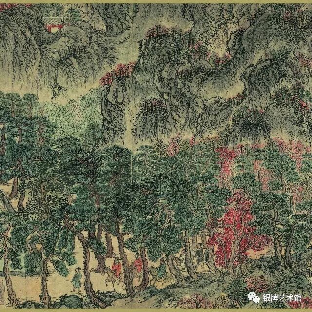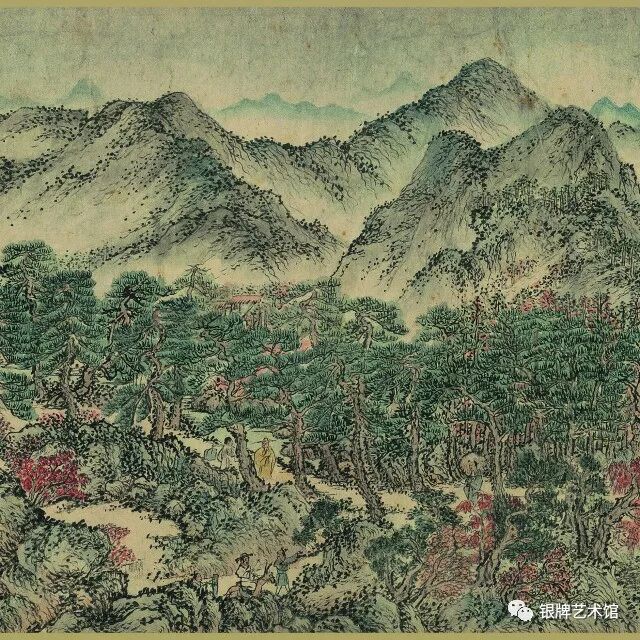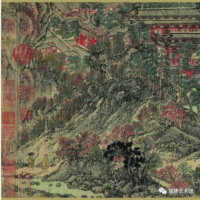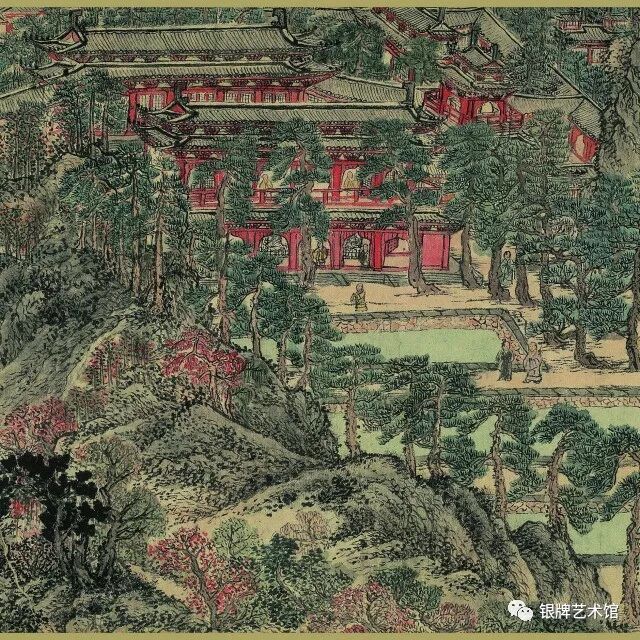 画面上松林苍郁茂密,萧寺殿阁、草堂茅屋掩隐其间,骑者僧侣各行其道。