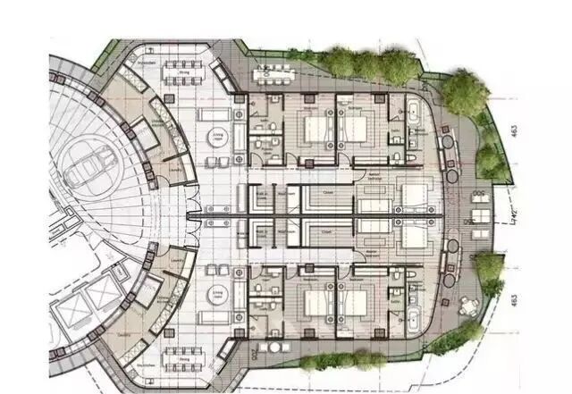类型A:2个有围绕中央核心区的曲线起居室的单元;