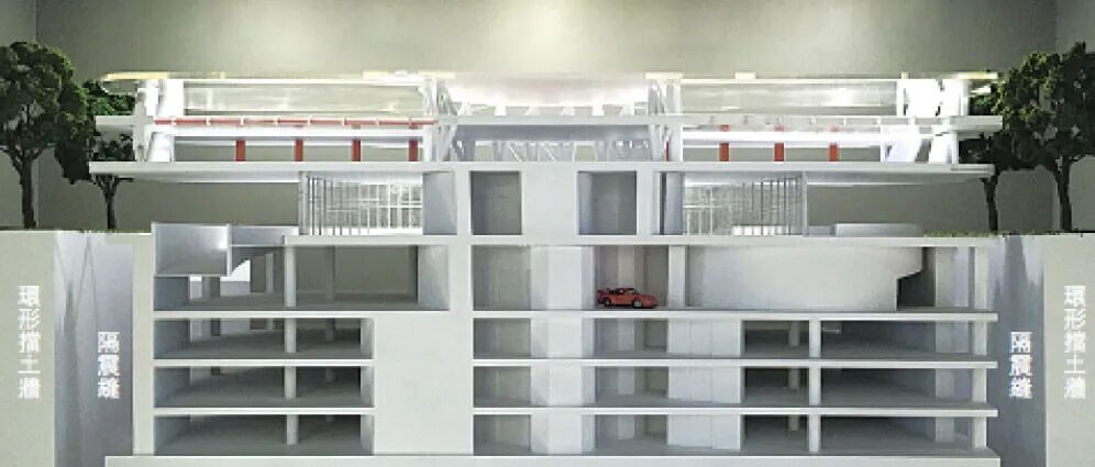 与传统的梁下只有2.10m高、光线阴暗的停车场相反,陶朱隐园项目的停车场具有自然采光。实际上,与抗震缝结合在一起的采光井让自然光和新鲜空气进入到地下室,从而实现了停车场以及与之相连的设施(游泳池和健身房)的自然通风。而提供了一个更为舒适的地下停车体验。