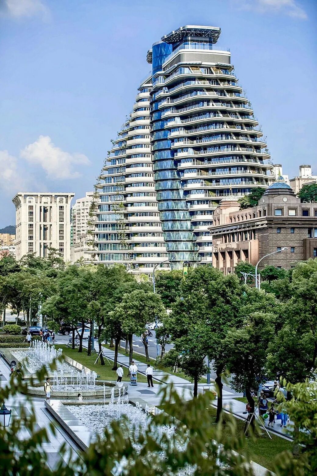 陶朱隐园的造型以DNA的双螺旋结构为灵感,每两个住宅单元构成了一个完整的楼层,住宅的每一层都会按顺时针方向旋转4.5°,因而从底部到顶部,双螺旋中的20个居住层最终实现了90度的自我拉伸和扭转,寓意生命之源、生机勃勃、成双成对。