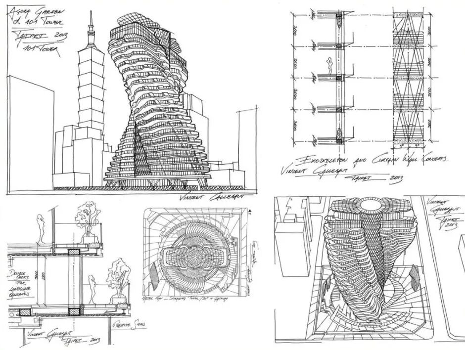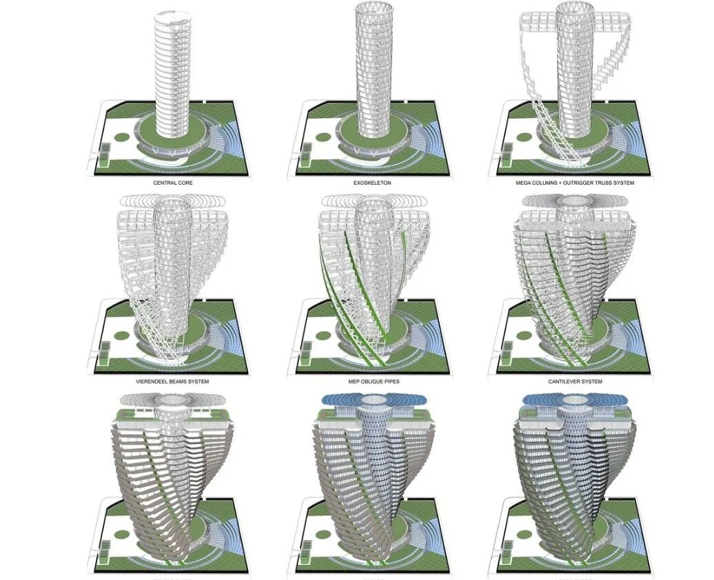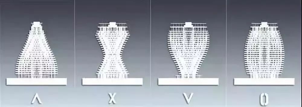 从不同的角度看,塔楼将呈现出无限变化的观感,其中最主要的几种形态分别是锥形、十字形、倒锥形和椭圆形。